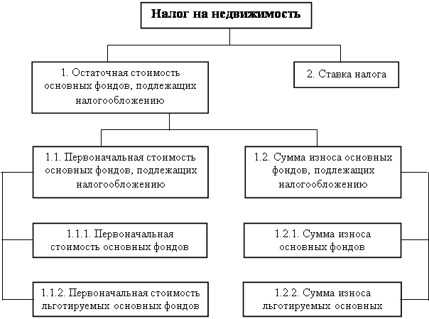 Рис. 3.3.1. Структурно-логическая модель налога на недвижимость Такая модель наглядно демонстрирует основные факторы первого и второго порядка, оказывающие влияние на изменение суммы налога на недвижимость. На основании данного рисунка проведем факторный анализ налога на недвижимость, уплачиваемого исследуемой организацией, для чего составим следующую таблицу. Таблица 3.3.2- Данные для факторного анализа налога на недвижимость Калинковичского райпо за 2005-2006гг.