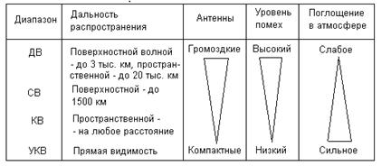 Таблица 2. Для повышения дальности связи применяют следующие методы: - подъем передающей или приемной антенн с помощью инженерных конструкций (матч, башен) и летно-подъемных аппаратов (аэростатов); - ретрансляция радиосигналов с помощью наземных и космических ретрансляторов; - использование тропосферных волн в УКВ диапазоне. Передающие антенны на башнях устанавливаются для постоянного обеспечения связи, радио и телевизионного вещания в городах, районах и областях. Для периодического и эпизодического приема сигналов от отдаленных источников в качестве носителей приемников сигналов используют привязные аэростаты. Информация с них на землю передается по кабелю или радиоканалу. Для передачи информации в УКВ и СВЧ диапазонах частот на большие расстояния широко применяются ретрансляторы. С помощью наземных ретрансляторов создаются радиорелейные линии (РРЛ), представляющие собой цепочку приемопередающих станций, каждая из которых устанавливается в пределах прямой видимости соседних. Все станции РРЛ разделяются на оконечные, промежуточные и узловые. Оконечные радиорелейные станции располагаются в начале и конце линии. На этих станциях вводится и выделяется информация, обеспечивается распределение информации между потребителями. Промежуточные станции предназначены для ретрансляции сигналов. Узловые радиорелейные станции - это промежуточные станции, на которых происходит разветвление принимаемых сигналов по различным направлениям, выделение части принимаемых передаваемой информации (например, программы телевидения) и введение новой информации. Диапазон частот, предназначенных для передачи информации одного вида, объединяются в радиочастотный ствол: телевизионный, телефонный и т. д. Существующие отечественные РРЛ могут содержать до 8 стволов, а ствол, например, телефонный - до 1920 телефонных каналов. Для каждого ствола с целью исключения взаимного влияния выделяются две рабочие частоты - для передачи и приема. Принятые каждой станцией сигналы на частоте приема усиливаются и преобразуются на частоте передачи и излучаются в направлении следующей станции. Около 30% телефонных каналов РФ обеспечивает радиорелейная связь. Разновидностью радиорелейных линий связи являются тропосферные линии связи, использующие явление рассеяние ультракоротких радиоволн в неоднородностях тропосферы. К таким неоднородностям относятся области тропосферы с резко изменившимися значениями диэлектрической проницаемости. Неоднородности вызываются неравномерностью состояний различных точек тропосферы, непрерывным перемешиванием и смещением воздушных масс в результате неравномерного разогрева Солнцем различных участков поверхности Земли и слоев тропосферы. Для устойчивой тропосферной радиосвязи применяют антенны с высоким коэффициентом усиления (40-50 дБ), мощные передатчики (1-10 кВт) и высокочувствительные приемники. Тропосферные линий связи чаще всего имеют протяженность 140-500 км. Ретрансляторы, устанавливаемые на искусственных спутниках Земли (ИСЗ), наиболее широко используются для обмена информацией между абонентами, удаленных друг от друга на тысячи километров. Они является элементами (звеньями) спутниковых линий связи, которые содержат также оконечные наземные передающие и приемные станции. Естественно, что связь возмо