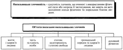 Схема 1 [14] Вивчення динаміки окремих видів найтяжчих насильницьких злочинів свідчить про несприятливі кількісні, а, особливо, їх якісні зміни. За останні 11 років кількість вбивств збільшилася в 3,2 рази, тяжкої шкоди здоров'ю (тяжкі тілесні ушкодження) – у 2, хуліганств – у 2 рази. Кількість вбивств у 1991 p. склала 1437, у 2001 p. вже 4572; тяжкої шкоди здоров'ю – відповідно 3239 та 6116 [22, 27; 20, 102]. На фоні зменшення на території України стану злочинності на 9% спостерігається зростання рівня насильницької злочинності в окремих регіонах країни. Так, найбільший приріст умисних вбивств у 2002 p. зареєстровано у Закарпатській (+45,2%), Харківській (+26,4%), Миколаївській (+11,0%) областях, а умисних тілесних ушкоджень в Чернівецькій (+35,4 %), Хмельницькій (+15,1%), Тернопільській (+10,0%), Івано-Франківській (+8,3%) та Вінницькій (+2,7%) областях [12, 2-3]. В цілому в Україні названа злочинність займає у структурі усієї злочинності в середньому 5-6%. Особливо треба відмітити те, що переважна кількість статевих злочинів через певні причини суб'єктивного характеру залишаються латентними. Тому реально питома вага насильницької злочинності є більшою у декілька разів. Проведене дослідження свідчить про наявність у структурі насильницької злочинності тенденції зростання таких злочинів, як: умисних вбивств та умисних тяжких тілесних ушкоджень, статевих злочинів, поєднаних з насильством хуліганств [23]. Ще одна тенденція, яка спостерігається сьогодні, – збільшення питомої ваги даних злочинів, що вчиняються жінками. Ця тенденція поширюється у всьому світі. Португальські вчені прийшли до висновку, що понад 28% жінок схильні до сексуальних зловживань через наявні у них порушення психіки. У той час як у чоловіків такі аномалії встановлюються лише у 2-9%. Виявлено також пряму залежність між сексуальним насиллям з боку жінки та зловживанням нею наркотичними речовинами або алкоголем [23]. За минуле десятиліття в Україні кількість жінок, засуджених за вчинення насильницьких злочинів, збільшилася у 3,2 рази. Вони беруть активну участь при вчиненні вбивств, зґвалтувань, розбещенні неповнолітніх, інколи, навіть, виступають як організатори або співвиконавці таких злочинів. Понад 98% цих жінок вживають алкоголь та психоактивні речовини (наркотики): кокаїн – 40,8% жінок, засуджених за насильницькі злочини; 19,4% з них зловживають амфітамінами і понад 13,3% мають діагноз "хронічний алкоголізм" [10, 63]. Занепокоєння викликає рецидив, у тому числі багаторазовий, який не закінчується двома, трьома судимостями. Так, у порівнянні з 1991 р. у 2,3 рази зросла кількість осіб, які раніше вже вчиняли злочини (1991 p. – 20932, 2001 p. – 47208 осіб) [22, 33-34; 20, 103-108]. Серед осіб, які мають психічні аномалії та скоїли насильницькі злочини, понад 33,3% мають одну та дві судимості (загальний рецидив). Певне місце у структурі зазначеної злочинності завжди займає хуліганство. Адже понад 26% насильницьких злочинів вчиняються саме з хуліганських мотивів. Взагалі кількість фактів останніх, що реєструються, легко піддається довільній фіксації. Така практика існувала завжди. І з урахуванням цієї обставини необхідно оцінювати дані про хуліганство за тривалий період: з 1991 p. по нині його динаміка має хвилеподібний характер. У 1991 p. зареєстровано 9164 злочини даного виду, а у 2001 p. – вже 17718 [22, 27; 20, 102]. За 11 років приріст склав 93%. За нашими даними, серед осіб, які мають а