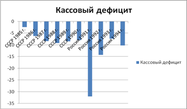 Рис. 2.5 Дефицит бюджетов СССР и России в период с 85-ого по 94-ый гг. Как видно из рис.2.5, самый серьезный кассовый дефицит возник в 1991 году. Расходы бюджета резко превышали доходы в период распада СССР и экономического кризиса. Государство было вынуждено поддерживать рушившуюся экономику новыми расходами, но из-за того, что часть территорий отделилась, у них сформировался собственный бюджет, страна потеряла значительную часть доходов в казну. И, как мы видим из табл.2.4, на протяжении всего исследуемого периода экономике страны так и не удалось выйти из дефицита бюджета. Табл. 2.4 Динамика доходов и расходов бюджетов СССР и России в период с 85-ого по 94-ый гг.