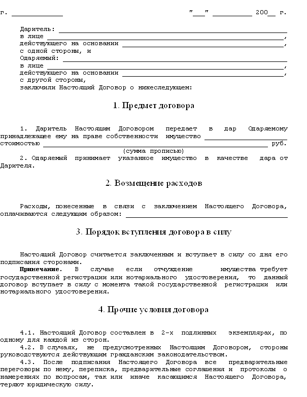Курсовая работа: Договор даренияКурсовая работа: Договор даренияФЕДЕРАЛЬНАЯ СЛУЖБА ПО НАДЗОРУ В СФЕРЕ ОБРАЗОВАНИЯ И НАУКИ Юридический институт Специальность 030501.65 "Юриспруденция" КУРСОВАЯ РАБОТА по дисциплине: Гражданское право на тему: Договор дарения Ангарск 2009 г. Содержание Введение Глава I. Общие положения договора дарения §1. Понятие договора дарения §2. Предмет договора дарения Глава II. Основные элементы договора дарения §1. Субъекты договора дарения §2. Содержание и форма договора дарения §3. Ответственность сторон по договору дарения Глава III. Прекращение договора дарения §1. Основания отмены дарения §2. Последствия отмены дарения Заключение Список литературы Приложение Введение Ещё в римском праве договором дарения признавалось неформальное соглашение, по которому одна сторона, даритель, предоставляет другой стороне, одаряемому, какие-либо ценности за счет своего имущества, с целью проявить щедрость по отношению к одаряемому. Дарение совершалось в различных правовых формах: посредством передачи права собственности на вещь, в частности, платежа денежной суммы, в форме предоставления сервитутного права и т.д. Частным случаем дарения было обещание что-то предоставить, совершить известные действия и т.д. - дарственное обещание. Договор дарения в римском праве не признавался классическими римскими юристами типичным договором, а относился к соглашениям, не подходящим ни под какой тип договоров. По мере развития римского частного права уже в императорскую эпоху римского права договор дарения, включая так называемое дарственное обещание, признавался типичным договором и защищался законодательством, независимо от формы его заключения. Уже в данную эпоху в полной мере учитывался римским правом и безвозмездный характер договора дарения, что предопределило установление специальных правил регулирования данного договора в части ответственности дарителя и отмены дарения. До революции 1917 г. правоотношения, связанные с дарением, являлись предметом оживленных теоретических дискуссий. Гражданское законодательство и гражданско-правовая доктрина того времени не давали четких однозначных ответов на вопросы о понятии дарения, его правовой природе, месте этого института в системе гражданского права. Достаточно сказать, что в гражданском законодательстве той поры нормы о дарении были размещены не среди положений о договорных обязательствах, а в разделе о порядке приобретения и укрепления прав на имущество. На фоне всестороннего и детального регулирования договора дарения в дореволюционном гражданском законодательстве и проекте Гражданского уложения особенно убогим представляется регулирование договора дарения в советском гражданском законодательстве. Все отношения, связанные с договором дарения, регламентировались в Гражданском кодексе РСФСР 1964 г. двумя статьями. Согласно первой из них, по договору дарения одна сторона передает безвозмездно другой стороне имущество в собственность. Договор дарения считается заключенным в момент передачи имущества. Дарение гражданином имущества государственной, кооперативной или общественной организации может быть обусловлено использованием этого имущества для определенной общественно полезной цели. Вторая статья предусматривала требования, предъявляемые к форме дог