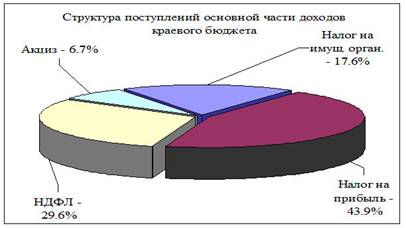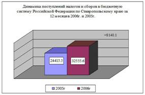 Рисунок 4 – Структура поступлений основной части доходов федерального бюджета Основные направления налоговой политики на 2007-2009 годы должны позволить в среднесрочной перспективе снизить налоговую нагрузку на экономику на 221,5 миллиарда рублей. По расчетам Минфина, уже в 2007 году планируемые меры позволят снизить налоговую нагрузку на 204,2 миллиарда рублей. В 2008 – 2009 годах снижение налоговой нагрузки должно составить 17,3 миллиарда рублей. В том числе поступления в федеральный бюджет, как планируется, уменьшатся на 15 миллиардов рублей, в региональные бюджеты – на 2,3 миллиарда рублей[13]. В общем же с 2001 года внесены существенные изменения в налоговое законодательство, в результате чего общее сокращение налогового бремени на экономику составило 7% ВВП. Вместе с тем, и это было отмечено в выступлении замминистра финансов Сергея Шаталова, повышение конкурентоспособности российской экономики и повышение качества институтов неизбежно требуют внесения изменений в налоговое законодательство. В частности предлагается снижать нагрузку на экономических агентов за счет проведения структурных преобразований налоговой системы: повышения качества налогового администрирования, нейтральности и эффективности основных налогов. Глава 2. Эффективность проведения налоговой политики в Ставропольском крае и по г. Ставрополю.2.1. Налоговая политика по Ставропольскому краюЗа двенадцать месяцев 2006 года в бюджет Ставропольского края (краевой, региональный) поступило 14319,3 млн. рублей, или 137,1% к поступлениям соответствующего периода прошлого года. Доля поступлений налоговых и неналоговых платежей в краевой бюджет за 2006 год составила 44,0% от общего объема поступлений во все уровни бюджета, что на 1,2 процентных пункта выше аналогичного показателя 2005 года (42,8 процента).