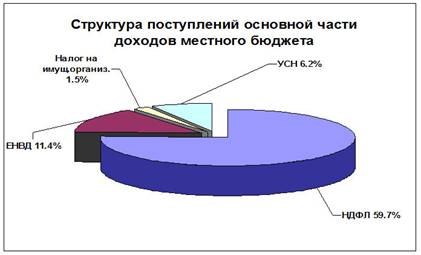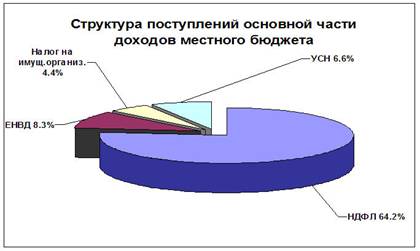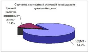 Рисунок 8 – Структура поступлений основной части доходов краевого бюджета Основная часть доходов местного бюджета сформирована за счет поступлений налога на доходы физических лиц – 3640,8 млн. рублей (64,2% от общего объема поступлений в местный бюджет), единого налога на вмененный доход – 591,7 млн. рублей (10,4 процента) (См. Приложение – Таблица 7). Доля поступлений налоговых и неналоговых платежей в местный бюджет за январь-декабрь 2006 года в размере 17,4 от общего объема поступлений во все уровни бюджета, на 0,5 процентных пункта выше аналогичного показателя 2005 года (16,9 процента). В доходы местных бюджетов Ставропольского края за 2007 год поступило 8349,9 млн. рублей, или 147,1% к поступлениям соответствующего периода прошлого года.