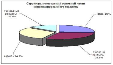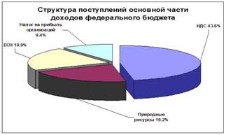 Рисунок 2 – Структура поступлений основной части консолидированного бюджета В федеральный бюджет за 2006 год поступило налогов и сборов 12561,7 млн. рублей, или 127,7% к соответствующему периоду 2005 года (9839,3 млн. рублей). Структура налоговых поступлений федерального бюджета несколько отличается от структуры поступлений консолидированного бюджета. Так, налог на добавленную стоимость обеспечил 51,8% поступлений налогов и сборов в федеральный бюджет, платежи за пользование природными ресурсами – 25,6%, налог на прибыль организаций – 10,5 процентов. За 2006 год поступления ЕСН (без учета расходов на нужды государственного социального страхования) составили 12144,5 млн. руб., в т.ч. в федеральный бюджет – 2763,8 млн. руб., в федеральные внебюджетные фонды – 9380,7 млн. рублей. В Территориальный фонд обязательного медицинского страхования поступило 893,8 млн. рублей. Поступления социальных платежей (без учета расходов на нужды государственного социального страхования) за январь-декабрь 2006 года в сравнении с соответствующим периодом прошлого года увеличилось на 2175,3 млн. рублей или 21,8 процента. За 2007 год в бюджетную систему РФ поступило 53755,5 млн. рублей, доходов администрируемых налоговыми органами, что на 19,7% больше поступлений прошлого года. В федеральный бюджет поступило 17145,7 млн. рублей, или 111,9% к соответствующему периоду 2006 года (15325,5млн. рублей). Основная доля поступлений федерального бюджета (92,1%) состоит из четырех видов налогов. Так, налог на добавленную стоимость обеспечил – 43,6% поступлений налогов и сборов в федеральный бюджет, единый социальный налог – 19,9%, платежи за пользование природными ресурсами – 19,2%, налог на прибыль организаций – 9,4 процента. (См. Приложение – Таблица 2).