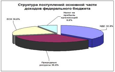 Рисунок 3 – Структура поступлений основной части доходов федерального бюджета За январь-февраль 2008 года в бюджетную систему РФ поступило 7791,1 млн. рублей, доходов администрируемых налоговыми органами, что на 24,3% больше поступлений прошлого года. В федеральный бюджет поступило 2618,1 млн. рублей, или 108,0% к соответствующему периоду 2007 года (2425,0млн. рублей). Основная доля поступлений федерального бюджета (88,9%) состоит из четырех видов налогов. Так, налог на добавленную стоимость обеспечил – 32,9% поступлений налогов и сборов в федеральный бюджет, платежи за пользование природными ресурсами – 30,6%, единый социальный налог – 18,8%, налог на прибыль организаций – 6,6 процента. (См. Приложение – Таблица 3)
