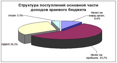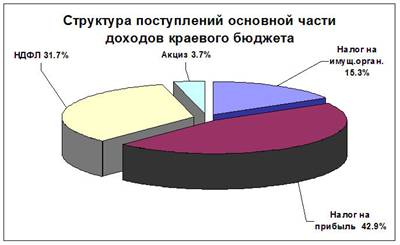 Рисунок 6 – Структура поступлений основной части дохода краевого бюджета за 2007г. Основная часть доходов краевого бюджета (89,9%) была сформирована за счет налога на прибыль организаций – 7006,5 млн. руб. (42,9% от общего объема поступлений в краевой бюджет), налога на доходы физических лиц – 5173,1 млн. руб. (31,7%), налога на имущество организаций 2505,3 млн. руб. (15,3 процента). По всем выше перечисленным доходам сложились значительные темпы роста: по налогу на имущество организаций (124,1 %), по налогу на доходы физических лиц (122,2 %), по налогу на прибыль организаций (111,5 процента) (См. Приложение – Таблица 5). За январь-март 2008 год в бюджет Ставропольского края (краевой) поступило 4776,7 млн. рублей, или 153,8% к поступлениям соответствующего периода прошлого года. Доля поступлений налоговых и неналоговых платежей в краевой бюджет составила 36% от общего объема поступлений во все уровни бюджета, что на 6,8 процентных пункта выше аналогичного показателя 2007 года (29,2 процента).