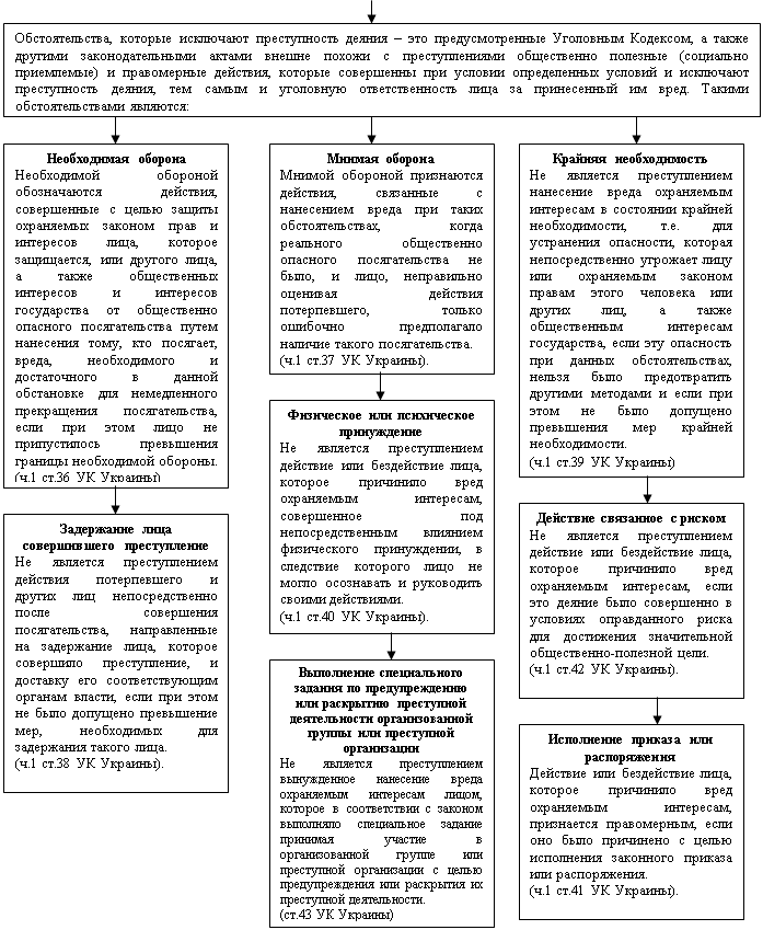 Введение В системе права необходимая оборона занимает особое место. В отличие от уголовного законодательства, определяющего, какие общественно опасные деяния являются преступными, и устанавливающего меру наказания, институт необходимой обороны определяет, в каких случаях действие, подпадающее под признаки деяния, предусмотренного уголовным законом, не является преступным, а в некоторых случаях даже полезным. Более того, институт необходимой обороны провозглашает право граждан на защиту интересов государства, общественных интересов, прав личности обороняющегося или другого лица от общественно опасного посягательства, путем причинения вреда посягающему, если не было при этом допущено превышение пределов необходимой обороны. Возможность граждан защищаться от опасных посягательств одно из важнейших прав гражданина, регламентируемых Основным законом государства, в Конституции записано, что каждый вправе защищать свои права и свободы всеми способами не запрещенными законом. Каждый имеет право на защиту своих прав и законных интересов, прав и законных интересов другого лица, общества, государства от общественно опасного посягательства независимо от возможности избежать посягательства, либо обратиться за помощью к другим лицам или органам власти. Современный период отмечен разгулом преступности: бандитизм, разбои, посягательства на жизнь и здоровье людей, рэкет, терроризм приобрели характер национального бедствия. Государство пока лишь вырабатывает широковещательные программы борьбы с преступностью, принимает суровые законы против лиц, совершивших преступления. Однако в некоторых случаях гражданам приходится рассчитывать только на себя, действовать в состоянии и в пределах необходимой обороны. Объект исследования — условия правомерности применения необходимой обороны Цель работы — дать определение понятию необходимой обороны, обнаружить условия правомерности ее применения и превышения ее границ, определить специальные виды необходимой обороны предусмотренные уголовным законодательством. В работе анализировались понятие и виды обстоятельств, которые исключают преступность деяния; дано определение необходимой обороны согласно с действующим законодательством Украины, а также раскрыты условия правомерности необходимой обороны, что характеризуют общественно опасное посягательство, условия ее правомерности относительно защиты и условия превышения границ необходимой обороны Раздел 1. Место необходимой обороны среди обстоятельств, исключающих преступность деяния Определение общего понятия обстоятельств, которые исключают преступность деяния, имеет важное научное и практическое значение. Главная роль такого понятия — отобразить все то объективно реально, что характеризует эти обстоятельства. Понятие отмеченных обстоятельств базируется на родовых свойствах (чертах, признаках) отдельных видов, фиксирует общее и единственное в них, акцентирует внимание на том, что их совмещает. Определить общие понятия того или другого явления — значит раскрыть его важнейшие черты, признаки. Рассмотрим данные признаки. Выражено внешнее поведение — а именно только она попадает в сферу права, оказывается в действии, бездеятельности или словесно. Естественно, что поводом для действия или бездеятельности до
