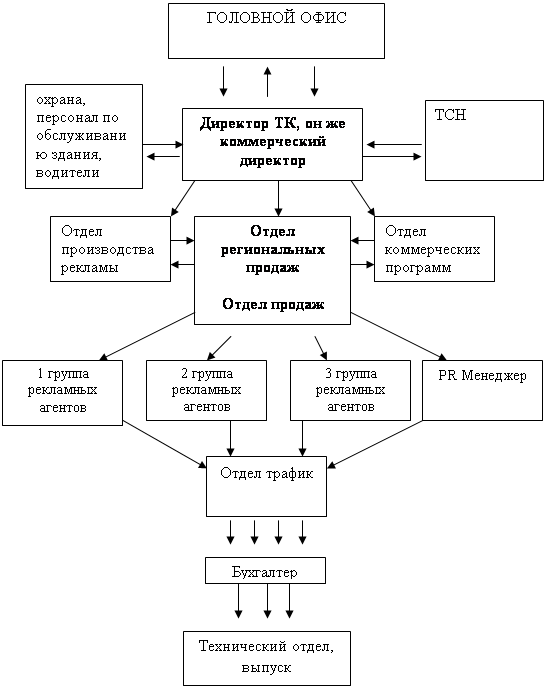 Рисунок 1 - Организационная структура телекомпании «ТНТ-Эфир»Основное обучение персонала строится на взаимодействии с соответствующими службами головного офиса. Как стажировки в Казани, так и обучение на месте силами Казанских специалистов. Для сотрудников ТСН успешная стажировка в Казани является непременным условием повышения категории. Обмен опытом со специалистами филиала г.Набережные Челны при проведении конкурса «ТЭФИР 2009» показал явные недостатки и преимущества в работе отделов ТСН и ОИР. Отделу производства (дизайнерам ОИР) требуется профессиональная помощь в дальнейшем развитии мастерства по изготовлению видеопродукции, так как не растет уровень изготовления продукции и, возможно, в дальнейшем потребуется аттестация. В системе управления персоналом существует система поощрений и взысканий. К примеру, для отдела ТСН – ежемесячное премирование за лучший сюжет. Существуют штрафы за нарушение распорядка и брака в работе. Для отдела продаж существуют бонусы за перевыполнение плана и поиск новых фирм и понижение гонорара за невыполнение плана. Для руководителей отделов, бухгалтера, секретаря и водителей имеются премии по результатам работы филиала за месяц при отсутствии замечаний по работе отделов, а также депремирование при наличии серьезных замечаний со стороны смежных служб и директора. Система материального поощрения и наказания показала себя достаточно эффективной, а главное - понятной. Отметим, что список причин для штрафов сотрудников ТСН составлялся по их же предложениям, что позволяет избежать чувства несправедливости наказания. Штрафы по отделу уменьшались из месяца в месяц, что указывает на действенность принятых правил по поощрению и наказанию сотрудников. К недостаткам в системе управления персоналом необходимо отнести то, что система оценки персонала не разработана. Аттестация персонала никогда не проводилась, и на современном этапе существует необходимость разработки соответствующих рекомендаций по внедрению системы оценки персонала. Таким образом, анализируемая компания - Нижнекамский филиал телекомпания «ТНТ-Эфир» - крупнейшей в России частной региональной телекомпании «Эфир» - предоставляет своим зрителям качественный телевизионный продукт, рекламодателем - эффективное средство коммуникации со своими потребителями. Для достижения коммерческого успеха, компания строит отношения со всеми заинтересованными сторонами на принципах честности, открытости и взаимовыгодного сотрудничества. Деятельность филиала направлена как на увеличение собственной доли сегмента рекламы, так и на формирование грамотного отношения своих клиентов к рекламе как таковой и ее роли в их бизнесе. Говоря о зрительской аудитории телеканала необходимо отметить, что у ТНТ – привлекательная потенциальная аудитория 18-45 лет. Канал ТНТ ориентирован на молодую и взрослую социально успешную, думающую аудиторию, которая является наиболее привлекательной для рекламодателя. Это значит, канал смотрят уверенные в себе, амбициозные и платежеспособные люди, выбор которых не случайный, а сознательный; не навязан, а четко определен личными предпочтениями. Цель телекомпании - достижение коммерческого успеха на рынке рекламы в соответствии с установленными доходами филиала на 2010 год (+10% к факту 2009 г.), увеличен