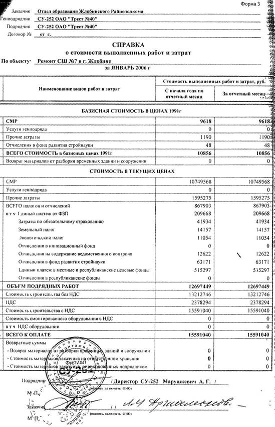 Приложение 2 ДОГОВОР СТРОИТЕЛЬНОГО ПОДРЯДА №21-08 г. Жлобин18 марта 200 Гомельское республиканское унитарное предприятие электроэнергетики «Гомельэнерго» именуемое в дальнейшем «ЗАКАЗЧИК», в лице директора филиала Гомельского республиканского унитарного предприятия электроэнергетики «Гомельэнерго» Жлобинские электрические сети Кудрявцева Василия Борисовича, действующего на основании доверенности РУП «Гомельэнерго» № 04-25/5465 от 14.11.2007 г., с одной стороны, и Открытое акционерное общество «Строительно-монтажный трест №40» именуемое в дальнейшем «ПОДРЯДЧИК», в лице управляющего Козлова Юрия Кирилловича, действующей на основании Устава, имеющее лицензию №02250/0192235 на право осуществления деятельности «Проектирование и строительство зданий и сооружений I и II уровней ответственности и проведению инженерных изысканий для этих целей», действительную до 23.05.2010 г., зарегистрированную в реестре лицензий Министерства архитектуры и строительства Республики Беларусь за №1513, с другой стороны, вместе именуемые «СТОРОНЫ», в соответствии с Правилами заключения и исполнения договоров (контрактов) строительного подряда, утвержденными постановлением Совета Министров Республики Беларусь от 15 сентября 1998 года №1450 (в дальнейшем – Правила) с изменениями и дополнениями, действующим законодательством и протоколом №___ от заседания конкурсной комиссии по переговорам с подрядчиком, заключили настоящий договор о нижеследующем: 1. Предмет договора 1.1.Предметом настоящего договора является ремонт объекта: Ремонт базы Жлобинского РТС. 1 очередь строительства. 1.2.Свои обязательства по исполнению настоящего договора, ОАО «Строительно-монтажный трест №40» передает своему филиалу – СУ-162 ОАО «Строительно-монтажный трест №40». 1.3.Заказчик обязуется принять законченный строительством объект в эксплуатацию и оплатить его в соответствии с ценой, установленной настоящим договором. 1.4.Начало строительства объекта – апрель 2008 г. 1.5.Срок ввода объекта в эксплуатацию – декабрь 2008 г. 2. Цена договора 2.1.Договорная цена строительства объекта на день заключения договора ориентировочно составляет: 2.1.1.в ценах 1991 года – 404.798 рублей; 2.1.2.на день заключения договора – 775.486.660 рублей; 2.2.Договорная цена объекта корректируется в случаях: 2.2.1.внесения в установленном порядке изменений в проектно-сметную документацию; 2.2.2.изменения законодательства о налогообложении и сборах (пошлинах) и иных отчислений в доходы соответствующих бюджетов; 2.2.3.изменения стоимости материалов, по сравнению с учтенной при расчете договорной цены. 2.3.Финансирование объекта производится за счет собственных средств Заказчика. 2.4.В стоимость объекта не включены и оплачиваются дополнительно работы, выявленные в процессе строительства, не предусмотренные в конкурсной документации, стоимость дополнительных работ определяется на основании трехстороннего акта, подписанного заказчиком, подрядчиком и проектной организацией, который подтверждает необходимость выполнения дополнительных работ. 3. Порядок расчетов 3.1.За расчетный период принимается календарный месяц. Финансирование и расчеты за выполненные работы по настоящему договору производятся Заказчиком на расчетный счет Подрядчика. 3.2.Заказчик выплачивает Подрядчику авансы в размере не более 50% от стоимости работ, планируемых к выпо