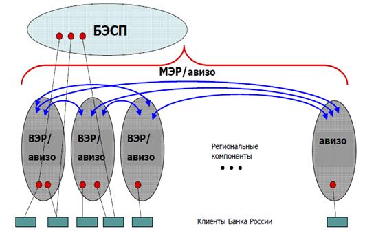 Рисунок 1. Действующая модель платежной системы Банка России Система БЭСП обеспечивает осуществление расчетов с использованием электронной технологии в режиме реального времени в масштабах страны. Системы ВЭР обеспечивают осуществление расчетов с использованием электронной технологии в региональных компонентах. Система МЭР обеспечивает осуществление расчетов с использованием электронной технологии между региональными компонентами. Система расчетов между учреждениями Банка России с применением авизо обеспечивает осуществление расчетов с использованием бумажной технологии на внутрирегиональном и межрегиональном уровнях. Платежи в перечисленных системах расчетов Банка России проводятся без каких-либо специальных требований к их размеру и назначению, на платной основе или бесплатно в соответствии с законодательством Российской Федерации. Банк России без взимания платы осуществляет операции со средствами федерального бюджета, средствами государственных внебюджетных фондов, средствами бюджетов субъектов Российской Федерации и средствами местных бюджетов. Для осуществления расчетов клиентам Банка России – всем кредитным организациям, действующим на территории Российской Федерации, их филиалам (по решению кредитной организации), Федеральному казначейству, его территориальным органам и другим организациям, не являющимся кредитными, открываются банковские (корреспондентские) счета (субсчета) в учреждениях Банка России, расположенных в регионах Российской Федерации. Платежи осуществляются в пределах остатка денежных средств на корреспондентском счете (субсчете) кредитной организации (филиала), имеющихся на момент оплаты, с учетом средств, поступающих в течение операционного дня, и кредитов Банка России в случаях, установленных нормативными актами Банка России и заключенными между Банком России и кредитными организациями договорами. Платежи с использованием электронных технологий составляют основную часть в платежах, проводимых через платежную систему Банка России. В 2008 году их доля достигла 99,7% от общего количества и 99,6% от общего объема платежей, проведенных через платежную систему Банка России.