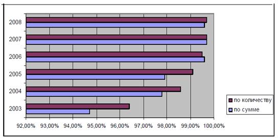 Рисунок 2. Динамика доли платежей, проведенных через платежную систему Банка России с использованием электронных технологий 2. Анализ практики применения различных форм безналичных расчётов и схемы документооборота 2.1 Расчёты с применением платёжных порученийРасчеты платежными поручениями - это самая распространенная в настоящее время в России форма безналичных расчетов. Платежное поручение представляет собой поручение предприятия обслуживающему банку о перечислении определенной суммы со своего счета. Эта форма расчетов имеет тенденцию более широко использоваться в условиях рыночной экономики. Расчеты платежными поручениями используются для совершения широкого спектра платежей: с их помощью рассчитываются с поставщиками и подрядчиками в случае предоплаты, органами пенсионного и стразового фондов, с работниками при переводе заработной платы на их счета в другие банки, при налоговых и иных платежах, при уплате банку комиссионных и т.д. По договоренности сторон платежи поручениями могут быть срочными, досрочными и отсроченными. Срочный платеж совершается при авансовых платежах, т.е. до отгрузки товара; после отгрузки товара, т.е. путем прямого акцепта товара; либо при частичных платежах при крупных сделках. Досрочный и отсроченный платежи возможны в рамках договорных отношений без ущерба для финансового положения сторон. К недостаткам данной разновидности расчетов платежными поручениями относят значительное усложнение и удлинение документооборота и отвлечение средств из хозяйственного оборота клиента. 2.2 Чековая форма расчётовЧек – ценная бумага, содержащая ничем не обусловленное распоряжение чекодателя банку провести платеж указанной в нем суммы чекодателю. Чекодателем является лицо (юридическое или физическое), имеющее денежные средства в банке, которыми он вправе распоряжаться путем выставления чеков, чекодержатель – лицо (юридическое или физическое), в пользу которого выдан чек, плательщиком – банк, в котором находятся денежные средства чекодателя [13]. В соответствии с Гражданским кодексом РФ чек должен содержать следующие обязательные реквизиты: - наименование «чек», включенное в текст документа; - поручение плательщику выплатить чекодателю определенную денежную сумму; - наименование плательщика и указание счета, с которого должен быть произведен платеж; - указание даты и места составления чека; - подпись лица, выписавшего чек, - чекодателя. 2.3 Аккредитивная форма расчётовСфера применения аккредитивной формы расчётов недостаточно широка, её удельный вес в структуре форм безналичных расчётов относительно невелик, но стабилен как в условиях административно-командной экономики, так и рыночной. Сущность аккредитивной формы расчётов состоит в том, что плательщик поручает обслуживающему его банку произвести за счёт средств, предварительно депонированных на счёте, либо под гарантию банка оплату товарно-материальных ценностей по месту нахождения получателя средств на условиях, предусмотренных плательщиком в заявлении на открытие аккредитива. Аккредитив представляет собой условное денежное обязательство банка, выдаваемое им по поручению клиента в пользу его контрагента по договору, по которому банк, открывший аккредитив (банк-эмитент), может произвести поставщику платёж или предоставить пол