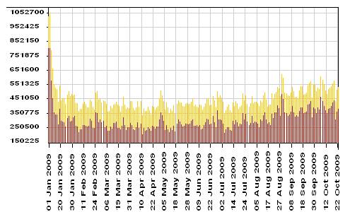 Рисунок 3. Сведения об остатках средств на корреспондентских счетах кредитных организаций РФ и Московского региона в Банке России (включая остатки средств на ОРЦБ и корсчете АРКО), млн. руб. (на начало операционного дня). c 01.01.2009 по 23.10.2009. |
