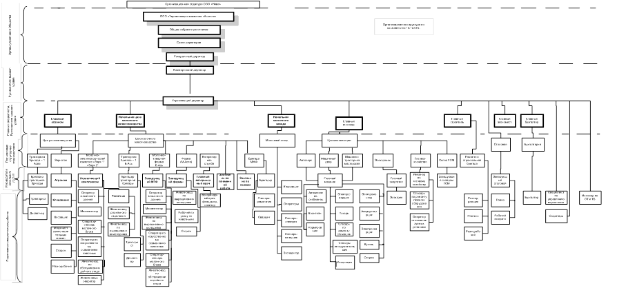 Рисунок 1.1 - Географическое расположение объектов агрохолдинга "Ашатли" Общество с ограниченной ответственностью "Нива" Уинского района Пермской области образовано 1 января 2002 года на базе бывшего подразделения ПСХ "Нива" предприятия "Пермтрансгаз", именуемое в дальнейшем "Общество". До 21 сентября 2005 года учредителями Общества являлись предприятие "Пермтрансгаз" и директор ООО "Нива" Зомарев Иван Дмитриевич, а начиная с 21 сентября 2005 года единственным учредителем становится ООО "Тулым". Общество создано в соответствии с законодательством РФ, и действует на основании настоящего Устава и законодательства Российской Федерации. Общество имеет расчетный счет в банке, круглую печать со своим наименованием, эмблему, штампы, бланки и другие реквизиты. Предприятие имеет самостоятельный баланс. Юридический и почтовый адрес: 617530 Пермский край, Уинский район, село Аспа, улица Молодежная-1а. Землепользование Общества расположено в западной части Уинского района. Административно-хозяйственный центр - с. Аспа. Расстояние до районного центра с. Уинское - 18 километров, до железнодорожной станции города Чернушка - 45 километров, до областного центра город Пермь - 200 километров. Связь с пунктами сдачи сельскохозяйственной продукции и железнодорожной станцией осуществляется автомобильным транспортом по дороге с асфальтовым покрытием. Организационная структура представляет собой совокупность производственных, вспомогательных и обслуживающих подразделений. Основной формой организации труда является производственная бригада, состав которых и численность зависят от направления цеха, принятой технологии и уровня механизации. Цели и виды деятельности Основными видами деятельности Общества являются производство молока, мяса, зерна. Хозяйство имеет свой молочный завод, где занимается переработкой молока, производя сыр, масло, творог, сметану. Общество занимается семеноводством зерновых культур и многолетних трав. Основной целью деятельности общества является следующие: извлечение прибыли; расширение и развитие производства; выпуск качественной продукции. Миссии и ценности компании Миссия общества: активно развиваемся, несем инновации в сельское хозяйство, заботимся о здоровье людей. Главной целью является развитие, расширение и стремление достичь высших результатов в сельскохозяйственной деятельности, применяя современные технологии, используя научно-технический прогресс, при этом не забывая о здоровье людей. Выпускаемая продукция должна соответствовать всем требованиям качества и полезности, при этом быть доступной для всех категорий граждан (приемлемые цены). Ценности компании: лидерство, ответственность, командность. Каждый работник должен обладать лидерскими качествами, умением принимать правильное и быстрое решение, быть ответственным. Ведь только при едином сплоченном коллективе возможно достижение поставленных целей. 1.2 Организационная структура предприятияОрганизационная структура ООО "Нива" (приложение А) сформированная с целью обеспечения достижения целей Общества, построена по линейно-функциональному признаку. Предприятие осуществляет свою деятельность в соответствии с действующим законодательством Российской Федерации и Уставом предприятия. Руководителем является управляющий директор. В подчинении у 
