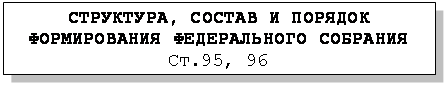 Курсовая работа: Совет Федерации Федерального Собрания Российской ФедерацииКурсовая работа: Совет Федерации Федерального Собрания Российской ФедерацииКурсовая работа по дисциплине «Конституционное (государственное) право Российской Федерации» «Совет Федерации Федерального Собрания Российской Федерации» Содержание Введение 1. Исторические корни принципа народного представительства 2. Федеральное Собрание в системе органов государственной власти Российской Федерации 2.1 Внутренняя организация Совета Федераций Федерального Собрания 2.2 Формирование Федерального Собрания России: проблемы реализации 2.3 Проблемы законодательной деятельности Федерального Собрания 2.4 Законопроекты о выборности членов Совета Федерации Заключение Глоссарий Список использованных источников Приложение А. Статус Федерального Собрания Приложение Б. Структура, состав и порядок формирования Федерального Собрания Приложение В. Сравнительная характеристика внесенных в Госдуму законопроектов о выборности членов Совета Федерации РФ Введение Появление в России профессионального, постоянно действующего представительного и законодательного органа явилось итогом длительного и противоречивого исторического развития института народного представительства. Отдельные элементы народного представительства существовали в Киевской Руси, Великом Новгороде и Московском государстве. Однако первой попыткой учредить регулярные представительные органы считается созыв в 1550 г. Земского собора, принявшего Судебник. Политическая эволюция советской формы народного представительства предопределила переход к парламентской форме, основанной на принципе разделения властей. В ходе конституционной реформы 1988-1990 гг. была учреждена «двухэтажная» парламентская система, включавшая Съезд народных депутатов и формируемый им двухпалатный Верховный Совет. Стать подлинным парламентом страны эти органы власти так и не смогли, во-первых, в силу возлагавшихся на них действовавших тогда Конституцией полномочий, противоречивших принципу разделения властей, а во-вторых, в силу фактически существовавшего вертикального подчинения представительных органов страны, совершенно не свойственного парламентским представительным органам. После осуществления конституционной реформы в конце 1993 г. органы советской власти прекратили свою работу как на общегосударственном уровне (Съезд, Верховный Совет), так и в большинстве субъектов Федерации. Принятая 12 декабря 1993 года Конституция Российской Федерации закрепила статус двухпалатного парламента России. Ст.94 Конституции Федеральное Собрание характеризуется как представительный и законодательный орган Российской Федерации. Будучи представительным органом, Федеральное Собрание реализует политическую волю народа, а в качестве законодательного органа власти, Федеральное Собрание обладает полной и ничем не ограниченной в рамках полномочий Российской Федерации и ее Конституции компетенцией в сфере законодательства. Кроме того, Федеральное Собрание исполняет некоторые контрольные функции за исполнительной властью. В связи с тем, что согласно Конституции РФ, функция и компетенции обеих составных частей Федерального Собрания различны, обеспечивается так называемая система «сдержек и противовесов» в деятельно