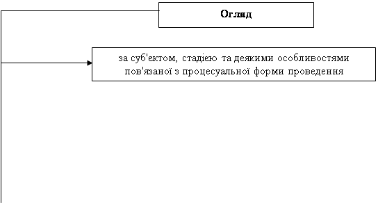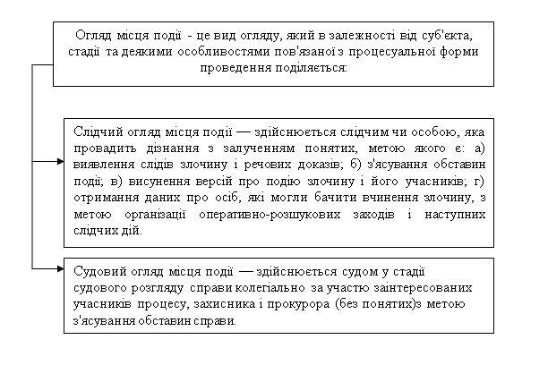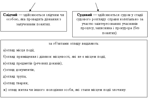судового розгляду за об'єктами огляду виділяють: а) огляд місця події; б) огляд приміщення і ділянок місцевості, які не є місцем події; в) огляд предметів (речових доказів); г) огляд документів; д) огляд трупа; є) огляд тварин; ж) огляд житла чи іншого володіння особи, які стали місцем події злочину[5]. Огляд місця події — один із видів слідчого огляду. Ця слідча дія проводиться з метою виявлення слідів злочину, з`ясування механізму вчинення злочину, обстановки його здійснення, інших обставин, які мають значення в справі, що розслідується. Місце події — це широке поняття, яким можуть охоплюватися: місце приготування до злочину, місце безпосереднього вчинення злочину, місце виявлення слідів і знарядь злочину та місце їх приховання.”[6] Місце злочину і місце події — поняття, які не завжди співпадають: місце події— поняття більш широке, бо воно пов'язане з виявленням ознак, що мають відношення до події злочину; місце злочину - це місце безпосереднього вчинення злочинного наміру, яке спричинило певні матеріальні зміни (наявність слідів злому, взуття, крові та ін.). Зміст слідчої дії визначається об'єктом, на дослідження якого вона спрямована. Об'єкт дослідження визначає як характер пізнавальних операцій, необхідних для досягнення мети слідчої дії, так і процесуальну форму їх здійснення. Під місцем події логічно розуміти територію, приміщення або будівлю, де відбулася подія, яку розслідують, або настав її результат. Місце події як об'єкт огляду завжди являє собою складну та неповторну систему різноманітних за своїми якостями і характеристиками предметів та інших матеріальних утворень (територія підприємства, жиле помешкання, магазин, автомобільна магістраль, пасажирський вагон, лісовий масив тощо). Огляд повинен забезпечувати можливість виявлення та закріплення слідів злочину в межах обстановки будь-якого місця події, мати своєрідну пізнавальну універсальність, включати прийоми та методи, що забезпечують всебічне дослідження будь-яких об'єктів матеріального світу. Суть огляду полягає в безпосередньому сприйманні слідчим обстановки місця події, вивченні та дослідженні матеріальних джерел доказової інформації. Слідчий особисто повинен переконатися в наявності матеріальних джерел, їхніх ознаках та властивостях, зафіксованих у протоколі огляду. Огляд місця події у невідкладних випадках може бути проведений до порушення кримінальної справи. У цьому разі, за наявності для того підстав, кримінальна справа порушується негайно після огляду місця події. Про результати огляду слідчий складає протокол. Огляд житла чи іншого володіння особи проводиться лише за вмотивованою постановою судді, яка виноситься з додержанням порядку, встановленого ч. 5 ст. 177 КПК. ; Постанова судді оскарженню не підлягає. У невідкладних випадках, пов'язаних із врятуванням життя людей та майна чи з безпосереднім переслідуванням осіб, які підозрюються у вчиненні злочину, а також за письмовою згодою володільця огляд житла чи іншого володіння особи може бути проведено без постанови судді. Для проведення у невідкладних випадках огляду місця події в житлі чи іншому володінні особи, який здійснюється за її заявою або повідомленням про вчинений щодо неї злочин, а так само у разі відсутності цієї особи або неможливості отримати від неї згоду щодо проведення невідк