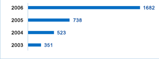 Рис.3.6 - Суммы заключенных договоров за 2003 - 2006 годы (млн. долл. США) Основным источником финансирования лизинговых операций Лизинговой группы "НОМОС-БАНКа" являются кредиты НОМОС-БАНКА. Длительная история отношений группы компаний "Балтийский лизинг" и ОАО "Промышленно-строительный банк (Санкт-Петербург)" доказали, что в лице профессиональной лизинговой компании инвестор находит надежного партнера и компания обеспечивает целевое использование предоставляемых денежных средств, гарантируя доходность и возвратность вложений. В своей работе для оплаты импортных контрактов, лизинговая группа "НОМОС-БАНКа" привлекает западное финансирование путём применения форфейтинговых схем. Это позволяет привлекать "длинные" деньги западных инвесторов и предлагать лизингополучателю выгодные условия на приобретение оборудования. Компанией также налажены партнерские отношения с ведущими зарубежными и отечественными производителями и поставщиками, что позволяет предложить своим клиентам современное оборудование по более привлекательным условиям лизинга. Стараясь предложить своим клиентам максимально широкий спектр услуг Лизинговая группа "НОМОС-БАНКа" оказывает услуги по сертифицированной оценке оборудования, объектов недвижимости. Методики оценки были разработаны специалистами компании с учетом лучшего зарубежного опыта и требований Российского законодательства. Своей главной задачей группа компаний "НОМОС - лизинг" ставит прозрачность бизнеса. С 1999 года компания осуществляет ежеквартальную трансформацию российской отчетности в МСФО. Аудитором группы компаний "Балтийский лизинг" с 1999 по 2000 год являлась компания KPMG, с 2001 года по настоящее время PricewaterhouseCoopers Audit. В 2006 году Группа компаний "НОМОС - лизинг" продолжила курс на повышение финансовой устойчивости бизнеса. Важнейшей составляющей этого курса является поддержание оптимального уровня диверсификации кредитного портфеля при сохранении стратегического партнерства с одним из крупнейших банков России. Стратегическим партнером группы компаний "НОМОС - лизинг" в 2006 году стал "НОМОС-БАНК", который входит в первую двадцатку ведущих банков России и имеет многолетний опыт работы в сфере инвестиций и лизинга. Другими крупными партнерами группы компаний "НОМОС - лизинга" также являются - ОАО Внешторгбанк, IFC (Международная Финансовая Корпорация-Группа Всемирного Банка), ЗАО "Международный Московский банк", ОАО "Энергомашбанк" и ОАО "Урало-Сибирский Банк". Группа компаний "НОМОС - лизинг" строит свою работу с инвестиционными институтами (российскими и зарубежными) на основе доверия и долговременного взаимовыгодного сотрудничества. Основа для анализа кредитоспособности - набор субъективных (структура собственности, управление, промышленное положение) и аналитических (качество активов, финансирование, ликвидность, рентабельность, левередж, капитализация) факторов. И субъективные и аналитические факторы в равной степени важны для анализа, поскольку все они взаимосвязаны. Каждый критерий должен быть принят во внимание. Субъективные факторы рассматриваются во всех общих кредитных исследованиях. Рейтинговые оценки формируются исходя из структуры собственности эмитента, характеристик кредитов, возможной величины рисков, связанных с арендуемым оборудованием, стратегии дейс