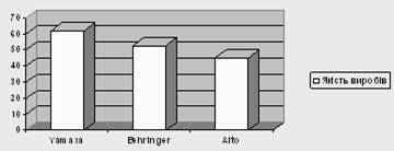 Загальна оцінка якості виробів фірм Yamaxa, Behringer, Alto виробляється підсумовуванням балів отриманих кожним виробом. Загальний оцінка якості виробів фірм Yamaxa становить: (12 +11+10+9+14+15+12+12+12+12) : 2 = 61,5 Загальна оцінка якості виробів фірми Behringer становить: (13 +12+7+10+11+9+12+10+11+10) : 2 = 52, 5 Загальна оцінка якості виробів фірми Alto становить: (8+9+7+9+12+10+9+6+9+10) : 2 = 44, 5. Результат даного аналізу відбиті на малюнку (див. рис. 1.17)