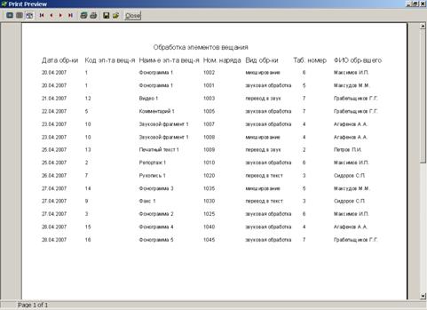 Рисунок 2.22 - Внешний вид отчета "Обработка элементов вещания" 2.5 Получение справки по работе с приложениемПользователь может получить справку по работе с приложением при выборе соответствующего пункта главного меню окна приложения. При этом запускается Internet-броузер (программа для просмотра файлов в формате HTML, в данном проекте - это Internet Explorer) пользователю предоставляется справочный файл в виде гипертекстового документа. Он содержит общую информацию о предметной области, структуру таблиц, входящих в базу данных, а также формы приложения и комментарии по работе с ними. Использование данной справки позволит пользователю получить необходимую помощь в затруднительных ситуациях как с точки зрения пользовательского интерфейса, так и работы по формированию программ радиовещания и учета данных об этом бизнес-процессе. 2.6 Краткое руководство пользователяРабота с приложением баз данных АРМ специалиста по формированию программ радиовещания должна начинаться с запуска исполняемого файла ARM_Radio. exe, находящемся в основном каталоге приложения (каталог, или папка, может размещаться на любом диске персонального компьютера и иметь любое название). Для нормальной работы приложения на компьютере требуется наличие Borland Database Engine. Создания псевдонима БД в системе не требуется. После запуска исполняемого файла пользователь имеет возможность работать с главным окном приложения, в котором располагается многостраничный элемент управления, каждая страница которого представляет собой отдельное диалоговое окно. В них располагаются табличные формы с данными об основных объектах предметной области - о передачах, элементах вещания, поставщиках этих элементов, сотрудниках радиостанции, а также о связях между ними - включении элементов вещания в передачи и обработке элементов сотрудниками. Установление связей между объектами и назначение возможных значений таких полей, как Формат хранения, Должность, Вид передачи (элемента, поставщика), облегчено использованием распахивающихся списков непосредственно в ячейках табличных форм. На закладках Включение в сценарий и Обработка многостраничного элемента управления имеется возможность выполнить фильтрацию записей в табличных формах с помощью установленных независимых переключателей, полей ввода текста и командных кнопок. На всех закладках главной формы имеется возможность включить или отключить сортировку записей в табличных формах по различным критериям, указанным в названии зависимых переключателей. На закладках Передачи, Элементы вещания, поставщики и Сотрудники имеется возможность поиска нужной записи в табличной форме путем ввода нужного значения в поле ввода текста, причем поиск по ближнему соответствию начинается при вводе уже первого символа. Приложение дает возможность с помощью пункта меню Выполнение запросов получить данные заполнении планируемой передачи элементами вещания, о количестве поставленных элементов вещания по поставщикам и об объемах обработки, выполненной сотрудниками по форматам хранения. С помощью пункта меню Выдача отчетов можно получить данные о ходе обработки элементов вещания. С помощью пункта меню Выдача справки пользователь может получить дополнительные сведения о предметной области и структуре таблиц базы данных. 3. Экономические расчетыСпр