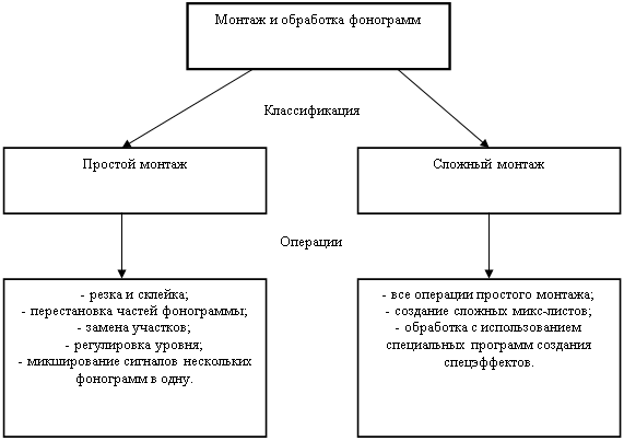 Рисунок 1.6 - Источники информации при первичном сборе материалов В первом случае запись репортажа после соответствующей обработки и монтажа идет непосредственно в эфир. Во втором варианте делается текстовая расшифровка репортажа, а затем эта расшифровка используется корреспондентами или редакторами при подготовке текста новостей. Источниками музыкальных материалов для формирования фонотеки на радиостанциях, как правило, являются музыкальные файлы формата MP3 (MPEG-1 ISO/IEC 11172-3 Layer 3), например, из сети Интернет, и компакт-диски. Еще одним источником музыкальных материалов является запись в студии радиостанции, но на коммерчеcких радиостанциях это делается крайне редко, вследствие высокой стоимости. Любые фонограммы, полученные на этапе первичного сбора материалов, как правило, подлежат дальнейшей обработке и монтажу. Для автоматизации процессов монтажа фонограмм существует специальное аппаратно-программное обеспечение. Обработка и подготовка к эфиру текстовых материалов. На этом этапе обрабатывается текстовая информация, полученная при первичном сборе материалов. Из поступивших сообщений отбираются те, которые представляют реальный интерес. На основе поступившей информации формируется текст информационных выпусков, подборка уже готовых фрагментов текста, подготавливается текст, который будет читаться дикторами в прямом эфире. Если требуется текстовая расшифровка корреспондентских репортажей, то это тоже выполняется на данном этапе. На крупных государственных радиостанциях, как правило, все без исключения звуковые материалы, используемые в передачах, имеют текстовую распечатку для утверждения администрацией, на коммерческих станциях это делается далеко не всегда. Студийная запись, монтаж и обработка фонограмм. Они выполняются параллельно с этапом обработки и подготовки к эфиру текстовых материалов [1-2]. Монтаж и обработка фонограмм (рисунок 1.7) разделяются на простой монтаж и сложный. Простой монтаж включает в себя: резку/склейку фонограммы, то есть вырезание участков фонограммы, вставку в фонограмму участков другой или той же самой фонограммы, замену выделенных частей фонограммы другими, перестановку частей фонограммы местами и другие подобные действия над фонограммой; регулировку уровня; микширование нескольких фонограмм в одну. При сложном монтаже, кроме перечисленных выше операций простого монтажа, осуществляется создание сложных микс-листов и обработка фонограмм с использованием специальных программ, служащих для создания спецэффектов (plug-ins). Студийная запись подразумевает запись фонограмм согласно подготовленным текстовым фрагментам (озвучивание текстов, подготовленных на этапе обработки и подготовки к эфиру текстовых материалов).