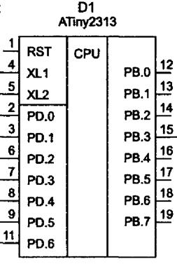 220 В Рисунок 2.1- Структурная схема электромузыкального звонка Функциональная спецификация представляет собой: 1. Входы а. 7 кнопок выбора мелодий (S1-S7); b. Кнопка запуска электромузыкального звонка (S8); с. Источник бесперебойного электропитания звонка (ИП). 2. Выходы а. Электронный ключ (Э/кл); b. Звуковой динамик (Звуковой излучатель). 3. Функции а. Запись мелодии в память, при нажатии кнопки S8; b. Воспроизведение мелодии из памяти; c. Осуществление бесперебойного электропитания в двух режимах: автономном и от сети. 2.3 Аппаратные средства микроконтроллеров серии ATtiny2313 В разработке электромузыкального звонка предлагается использовать, широко распространенный, относительно недорогой и надежный в эксплуатации 8 битный AVR микроконтроллер серии ATtiny2313 с 2 КБ программируемой в системе Flash памяти. ATtiny2313 - низкопотребляющий 8 битный КМОП микроконтроллер с AVR RISC архитектурой. Выполняя команды за один цикл, ATtiny2313 достигает производительности 1 MIPS при частоте задающего генератора 1 МГц, что позволяет разработчику оптимизировать отношение потребления к производительности. AVR ядро объединяет богатую систему команд и 32 рабочих регистра общего назначения. Все 32 регистра непосредственно связаны с арифметико-логическим устройством (АЛУ), что позволяет получить доступ к двум независимым регистрам при выполнении одной команды. В результате эта архитектура позволяет обеспечить в десятки раз большую производительность, чем стандартная CISC архитектура. ATtiny2313 имеет следующие характеристики: 2 КБ программируемой в системе Flash память программы, 128 байтную EEPROM память данных, 128 байтное SRAM (статическое ОЗУ), 18 линий ввода - вывода общего применения, 32 рабочих регистра общего назначения, однопроводный интерфейс для встроенного отладчика, два гибких таймера/счетчика со схемами сравнения, внутренние и внешние источники прерывания, последовательный программируемый USART, универсальный последовательный интерфейс с детектором стартового условия, программируемый сторожевой таймер со встроенным генератором и три программно инициализируемых режима пониженного потребления. В режиме Idle останавливается ядро, но ОЗУ, таймеры/счетчики и система прерываний продолжают функционировать. В режиме Power-down регистры сохраняют свое значение, но генератор останавливается, блокируя все функции прибора до следующего прерывания или аппаратного сброса. В Standby режиме задающий генератор работает, в то время как остальная часть прибора бездействует. Это позволяет очень быстро запустить микропроцессор, сохраняя при этом в режиме бездействия мощность. Прибор изготовлен по высокоплотной энергонезависимой технологии изготовления памяти компании Atmel. Встроенная ISP Flash позволяет перепрограммировать память программы в системе через последовательный SPI интерфейс или обычным программатором энергонезависимой памяти. Объединив в одном кристалле 8- битное RISC ядро с самопрограммирующейся в системе Flash памятью, ATtiny2313 стал мощным микроконтроллером, который дает большую гибкость разработчика микропроцессорных систем. ATtiny2313 поддерживается различными программными средствами и интегрированными средствами разработки, такими как компиляторы C, макроассемблеры, программные отладчики/симуляторы, внутрисхемные эмуляторы и ознакомительные наборы. Характеристики микроконтроллера ATtiny2313 AVR RI