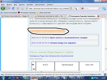 Структура і функціональне призначення модулів системи, їх взаємозв’язок 3.2 Розробка програмних модулів В даному розділі описується створення шаблона для Joomla 1.5. Шаблон створюється для настроюваня зовнішнього вигляду сайту. У шаблон Joomla! входять: - Файл index.php, визначає базову структуру сторінки Joomla Сайту - Файл CSS-стилів, який дозволяє регулювати оформлення блоків сторінки Joomla! (Кольори, розміри шрифтів тощо) - XML-файл для встановлення шаблона через адміністраторську панель Joomla! - Графічний файл попереднього перегляду шаблону Joomla! 3.3 Інструкція користувача Реєстрація на сайтіДля будь-яких правок та створення статей на сайті http://gromrada.org.ua/ необхідно зареєструватися в системі. Реєструватись на сайті потрібно лише один раз, коли Ви вперше розпочинаєте роботу в середовищі. Для того щоб коректно зробити це, необхідно пройти просту процедуру: · Заповніть форму реєстрації. Для цього необхідно перейти за посиланням «Вхід/реєстрація», яке знаходиться в лівому нижньому куті сторінки.