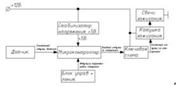 При поступлении питания, микроконтроллер загружает программу, а так же переменные х и В в ОЗУ из памяти EEPROM, после чего ожидает входной импульс с датчика Холла, сигнализирующий о запуске двигателя. Обеспечив начальное смещение импульса А, равное Ти * х, и рабочее смещение В, микроконтроллер подает импульс на ключевую схему, обеспечивая тем самым своевременное искрообразование.