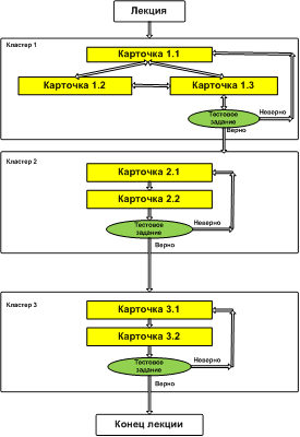 Рисунок 2.16 – Создание элемента Лекция. Основные настройки Введем в поле Название: «Введение в Multisim». Не будем ограничивать лекцию по времени, а «Максимальное количество ответов в карточке» установим равным 2. Чтобы каждый кадр лекции смотрелся хорошо, в «Форматировании урока» установите: · «Слайд-шоу» — «Да»; · «Показывать слева список страниц» — «Да»; · ширину, высоту слайда и цвет фона установите по собственному усмотрению. Остальные параметры Лекции пока оставим без изменений. Нажмите кнопку «Save and display». 2.8 Создание лекцииДля изучения возможностей и способов эффективного использования элемента Лекция рассмотрим структуру данного элемента. Элемент Лекция состоит из некоторого количества кластеров. В каждом кластере имеются карточки и тестовые задания. Под кластером понимается одна из глав лекции. Карточки представляют собой отдельные разделы в главе. Внутри кластера можно переходить от одной карточки-раздела к другим. В конце кластера или в конце карточки-раздела помещается тестовое задание. Если тестовое задание выполнено правильно, то студент получает доступ к следующему кластеру или к следующей карточке-разделу. Если тестовое задание выполнено не правильно или не набрано определенное количество баллов, то студент автоматически возвращается в начало кластера или к началу карточки-раздела. Например, на рисунке 2.17 изображена лекция, которая состоит из трех кластеров. В первом кластере содержится три карточки, между которыми есть кнопки перехода, и одно тестовое задание. Во втором и третьем кластере по две карточки. В конце каждого кластера имеется тестовое задание и переходы в зависимости от результатов выполнения задания. При создании лекции можно обойтись без кластеров, а применять только карточки-разделы и тестовые задания. Кластеры введены исключительно для удобства структурирования материалов лекции. Лекция может быть организована как набор некоторого количества карточек, которые называют еще флеш-карточками. Каждая карточка содержит изучаемый материал или страницу с вопросами. Карточки демонстрируются студентам в произвольном порядке, т.е. у элемента Лекция не будет явного четкого начала и окончания. Изучив и выполнив определенное заданное при настройке количество флеш-карточек, лекция считается завершенной и студент получает оценку.