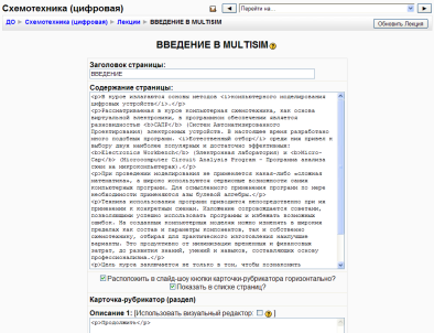 Присвоим короткое имя нашему курсу — Схемотехника (цифровая). Заполнение остальных полей не обязательно, Moodle по умолчанию присваивает наиболее подходящие значения всем параметрам курса. Рассмотрим наиболее важные их них. Категория — если до создания курса вы не выбрали категорию, то можно сделать это теперь. Из выпадающего списка нужно выбрать подходящую категорию курса. Краткое описание — краткое описание содержания курса. Для нашего курса можно написать следующее: «В курсе рассматриваются принципы работы цифровой электроники, базовые элементы цифровых схем, стандартные схемы включения этих элементов, алгоритмы проектирования цифровых устройств - от простейших до сложных. Проектирование ведется в программах MultiSim и UltiBOARD. MultiSim - это уникальная возможность разработки схемы и ее тестирование из одной среды разработки. UltiBOARD - автоматизирует процесс конструирования печатной платы.». Формат курса: форма организации курса. Moodle предлагает следующие форматы: · Календарь (CSS) – календарная организация расписания курса (неделя за неделей) с точным сроком начала и окончания. · Структура – организация курса по темам. · Сообщество (форум) – курс организуется на основе одного большого форума. Может использоваться не только как курс, но и как одна большая доска сообщений. Для создаваемого нами курса используем тематическую организацию (Формат курса — Структура). Количество тем/недель — этот параметр определяет, сколько секций нужно создать на главной странице курса (для каждой темы/недели — отдельная секция). В нашем случае будет достаточно 26 тем. Группы — использование групповых режимов работы в курсе: · Нет групп — ученики не делятся на группы, каждый является частью одного большого сообщества. · Отдельные группы — группы изолированы друг от друга, работа учеников одной группы не видна для других групп. · Доступные группы — ученики каждой группы могут видеть, что происходит в других группах. Если групповой режим определен здесь, на уровне курса, то он является режимом по умолчанию для всех элементов, создаваемых в курсе. Если предполагается только для некоторых элементов курса организовать групповую работу, то группой режим лучше установить на уровне элементов курса. О значении остальных настроек курса вы можете узнать, используя кнопку помощи (знак вопроса), относящуюся к соответствующему элементу. Нажатие на кнопку «сохранить» внизу страницы завершает процедуру создания и настройки курса. Обычно после этого Moodle предлагает назначить роли, т.е. определить какие пользователи смогут работать в данном курсе и какие права иметь. Мы вернемся к этому вопросу чуть позже. Теперь вы можете вернуться на главную страницу (с помощью верхней строки, показывающей «путь») и увидеть созданный курс в списке курсов. 2.6.3 Изменение настроек созданного курсаЧасто необходимо скорректировать настройки созданного курса. Для этого: 1. В блоке Администрирование выберите пункт меню «Курсы — Добавить/редактировать курсы». 2. В открывшейся странице «Категории курсов» выберите категорию (щелкните), в которой находится курс. 3. В появившемся списке курсов найдите нужный курс и нажмите кнопку, относящуюся к этому курсу. Откроется страница редактирования настроек данного курса. 2.7 Наполнение курсаЗайдите на главную страницу созданного курса (щелкнуть