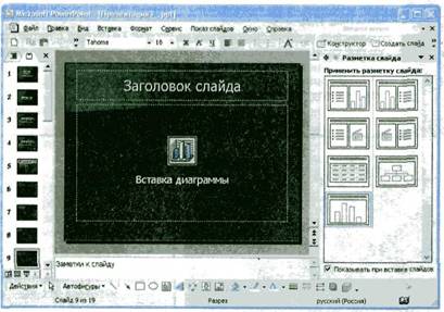 Мал.17.10. 3.5 Вставка до слайду графічних об'єктівДля вставки до слайду графічного об'єкта (малюнок, фотографії) потрібно створити новий слайд і обрати у вікні "Разметка слайда" авторозмітку "Заголовок, текст и графика". Відкриється слайд виду, що показаний на (мал.18.1).
