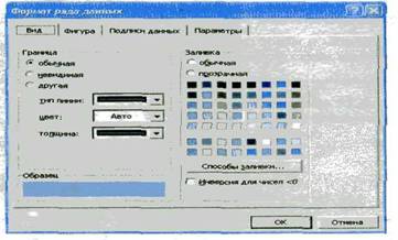 Мал.17.9. Відкриється однойменне вікно, в якому на закладці "Вид" (мал.17.10) необхідно в області "Заливка" обрати новий колір діаграми. Потім клацнути наприклад по ярко-зеленому кольорі, і область "Образец" змінить свій колір. Потім клацнути по кнопці "ОК".