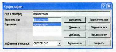 Мал.25.1. Обравши "Выдачи" ви можете настроїти в області "Выдачи" роз печатку роздаточного матеріалу. Можна настроїти тут також кількість слайдів на сторінці та порядок їх розташування. В області "Диапазон печати" можна обрати роз печатку всіх слайдів, слайдів із якогось діапазону або слайдів і якимись номерами. В строчці "Цвет или оттенки серого" можна в залежності від підключеного принтеру, обрати варіант роз печатки слайдів: в кольори, в сірих полу тонах або чорно-білий (без відтінків сірого). Встановивши прапорець "Масштабировать по листу", таким чином ви вкажете PowerPoint масштабувати слайд при роздрукуванні таким чином, щоб він займав максимальну величину листка. Прапорець "Обрамления слайдов" добавить при роз печатці рамки кругом слайдів. А встановивши прапорець "Печать примечания и рукописные примечания" дозволить розпечатати сторінки із примітками до слайдів. Після настройки всіх параметрів роз печатки, натисніть на "ОК" для відправки слайдів на принтер. 5.1 Перевірка правописуДля того щоб перевірити правопис, потрібно натиснути на клавішу "F8" на клавіатурі. Виявивши в тексті помилку, PowerPoint закінчить процес перевірки правопису та запропонує вам варіант виправлення (мал.26.1). Якщо ви згодні із PowerPoint, то клацніть по кнопці "Заменить", якщо ж ні то по кнопці "Пропустить".