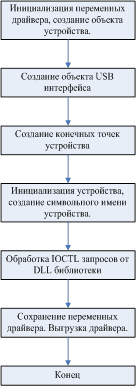 Рис. 4.1 – Структура программы микроконтроллера Драйвер устройства написан на языке “C++” в программном продукте Compuware Driver Studio 3.2.0. с использованием Microsoft Windows XP DDK. Запросы драйвера к USB устройству перечислены в пункте 4.1. На рисунке 4.2. представлена блок-схема, которая демонстрирует работу программы драйвера. 4.2.1 Структура программы драйвера устройства