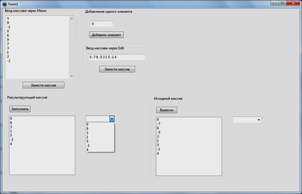 Рисунок 5 – Экранная форма 2.2 Листинг программы unit Unit1; {$mode objfpc}{$H+} interface uses Classes, SysUtils, FileUtil, LResources, Forms, Controls, Graphics, Dialogs, StdCtrls; type { TForm1 } TForm1 = class(TForm) Button1: TButton; Button2: TButton; Button3: TButton; Button4: TButton; Button5: TButton; ComboBox1: TComboBox; ComboBox2: TComboBox; Edit1: TEdit; Edit2: TEdit; GroupBox1: TGroupBox; GroupBox2: TGroupBox; GroupBox3: TGroupBox; GroupBox4: TGroupBox; GroupBox5: TGroupBox; ListBox1: TListBox; ListBox2: TListBox; Memo1: TMemo; procedure Button1Click(Sender: TObject); procedure Button2Click(Sender: TObject); procedure Button3Click(Sender: TObject); procedure Button4Click(Sender: TObject); procedure Button5Click(Sender: TObject); procedure FormCreate(Sender: TObject); private { private declarations } public { public declarations } end; var Form1: TForm1; X, Y: array [1..100] of integer; n, m: integer; implementation { TForm1 } procedure TForm1.FormCreate(Sender: TObject); begin n:= 0; end; procedure TForm1.Button1Click(Sender: TObject); var i: integer; begin // обнуление массива n:= 0; for i:= 1 to 100 do X[i]:= 0; // заполенние массива Х из строк мемо n:= Memo1.Lines.Count; // установить длину массива for i:= 1 to n do X[i]:= StrToInt(Memo1.Lines[i-1]); // занесения значения элемента из строки мемо end; procedure TForm1.Button2Click(Sender: TObject); begin inc(n); // увеличиваем счетчик элементов X[n]:= StrToInt(Edit1.Text); // занесение значения из эдит1 end; procedure TForm1.Button3Click(Sender: TObject); var s: string; i: integer; begin // обнуление массива n:= 0; for i:= 1 to 100 do X[i]:= 0; // выделение элементов между пробелами в эдит2 s:= Edit2.Text+' '; i:= pos(' ', s); while i<>0 do begin inc(n); X[n]:= StrToInt(copy(s, 1, i-1)); // занесение значения из эдит1 delete(s, 1, i); // удаление выделенного элемента из строки i:= pos(' ', s);// поиск следующего элемента end; end; procedure TForm1.Button4Click(Sender: TObject); var i: integer; begin // обнуление результата m:= 0; ListBox1.Clear; ComboBox1.Clear; // перебор исходного массива for i:= 1 to n do // сравнение значения элемента с диапазоном if (X[i]>=-3)and(X[i]<=7) then begin // занесение нового элемента в результирующий массив Y inc(m); Y[m]:= X[i]; // вывод элемента массива Y на экранные компоненты ListBox1.Items.Add(IntToStr(Y[m])); ComboBox1.Items.Add(IntToStr(Y[m])); end; end; procedure TForm1.Button5Click(Sender: TObject); var i: integer; begin ListBox2.Clear; ComboBox2.Clear; // перебор исходного массива for i:= 1 to n do begin ListBox2.Items.Add(IntToStr(X[i])); ComboBox2.Items.Add(IntToStr(X[i])); end; end; initialization {$I unit1.lrs} end. 2.3 Экранные формы