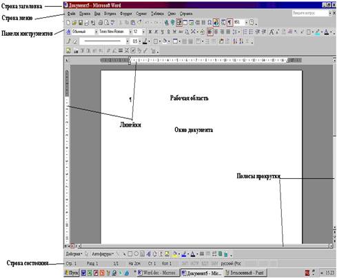 Окно Word содержит все элементы для редактирования и форматирования текстов. В верхней части окна расположены: 1. Строка заголовка, которая