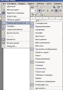 содержит кнопку управляющего меню - 2. Строка меню. Открывается меню: <Alt> или <F10>, или <Alt + подчеркнутая буква меню>. 3. Панели инструментов. Панели инструментов могут быть отображены на экране с помощью команды Вид => Панели инструментов. Всего доступно 22 панели инструментов. Настроить любую из них можно в диалоговом окне Настройка, которое открывается с помощью команд Сервис => Настройка или Вид => Панели инструментов => Настройка. 4. Под панелями инструментов располагаются линейка, которая помогает контролировать размещение элементов страницы и управлять операциями форматирования. Линейка выводится и убирается с помощью команды Вид => Линейки. 5. В рабочей области окна размещается окно документа с редактируемым текстом. Если окно документа развернуть на всю рабочую область, то оно совпадает с окном программы. В этом случае в верхнем правом углу окна расположены два ряда кнопок управления размером окна. Верхние кнопки относятся к окну программы, нижние – к окну документа. 6. Под вертикальной полосой