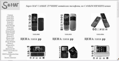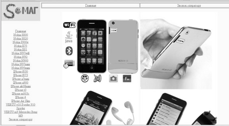 Рисунок 8-Схема: Открытая ссылка Данный сайт построен с использованием технологии фреймов. Благодаря технологии фреймов окно браузера делится на несколько частей (областей). Каждая часть по сути представляет собой отдельное окно, тем самым пользователю предлагается работать как-бы с несколькими окнами сгрупированными в единое целое. Особенности и объем контента Контент представляет собой каталог товаров, в котором приведены фотографии и описание различных средств связи (мобильных телефонов). Браузер открыв окно предлагает пользователю "Главную" страницу, где имеется перечень товаров и доступ к дополнительным опциям, все эти же возможности продублированы в блоке "Меню", который расположен в левой части страницы. Перейдя по ссылке товара можно ознакомится с его характеристиками, и далее воспользовавшись встроенными кнопками ссылками либо вернуться на "Главную" страницу, либо получить данные для связи с оператором. Связаться с оператором возможно так же через специальный пункт "Меню". Сайт создан с помощью языка разметки гипертекста HTML. При производстве использована технология фреймов. В качестве графической составляющей использованы рисунки в формате .jpg, т.к. данный формат сохраняет рисунок с минимальным объёмом (размером), размером 15—100КБ, и безопасная цветовая палитра. Объём сайта составляет—6,7МБ в обычном виде и 5,32—ввиде архива Win.rar. Источники для формирования контента сайта В качестве источников формарования сайта использованы общедоступные бесплатные рисунки и фотографии средств связи (мобильных телефонов). Обзоры (описания) продукции получены из свободно распространяемых рекламно-информационных и позновательных проспектах (брошурах). Полученные исключительно на законных основаниях. Средства и способы форматирования контента Для форматирования контента использованы средства языка разметки гипертекста HTML. Файлы содержащие кодировку HYML написаны в текстовом редакторе "Блокнот" переведены в формат HTML путём сохранения докуиента с соответствующим расширением (.html). Все рисунки выполнены в формате .jpg. 2.3 Разработка системы навигаци Средства навигации Вся навигация сведена к минимизации лишних переходов, и реализуется с помощью ссылок на страницы. Ссылки выполнены как в текстовом, так и в графическом формате. В графическом формате ссылка представляет собой рисунок, либо ячейку таблицы выполненную ввиде кнопки. Особенности системы навигации Система навигации данного сайта создана с учётом возможности перехода из ооного пункта в любогой пункт за одно нажатие ссылки. Так как сайт пострен с использованием технологии фреймов часть элементов остаются неизменными при любой просматриваемой странице. Логотип и пункты меню остаются неизменными, изменяется только часть окна браузера. В которой можно просмаривать все страницы по-очерёдно, на каждой странице для удобства встроены дополнительные ссылки выполняющие функции наиболее уместные в данном пункте, и не создающие путаницы для пользователя. 2.4 Особенности дизайна сайта Описание средств для создания дизайна Для создания дизайна использованы средства языка разметки гипертекста HTML. Размеры рисунков (фотографий) задаются специальными командами (операторами, тегами), с их помошью также произведено распределение объектов на страницах сайта. В качестве осно