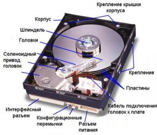 Рисунок 11. Внешний вид жесткого диска. Накопитель на жестком диске относится к наиболее совершенным и сложным устройствам современного персонального компьютера. Его диски способны вместить многие мегабайты информации, передаваемой с огромной скоростью. В то время, как почти все элементы компьютера работают бесшумно, жесткий диск ворчит и поскрипывает, что позволяет отнести его к тем немногим компьютерным устройствам, которые содержат как механические, так и электронные компоненты. Основные принципы работы жесткого диска мало изменились со дня его создания. Устройство винчестера очень похоже на обыкновенный проигрыватель грампластинок. Только под корпусом может быть несколько пластин, насаженных на общую ось, и головки могут считывать информацию сразу с обеих сторон каждой пластины. Скорость вращения пластин (у некоторых моделей она доходит до 15000 оборотов в минуту) постоянна и является одной из основных характеристик. Головка перемещается вдоль пластины на некотором фиксированном расстоянии от поверхности. Чем меньше это расстояние, тем больше точность считывания информации, и тем больше может быть плотность записи информации. Взглянув на накопитель на жестком диске, вы увидите только прочный металлический корпус. Он полностью герметичен и защищает дисковод от частичек пыли, которые при попадании в узкий зазор между головкой и поверхностью диска могут повредить чувствительный магнитный слой и вывести диск из строя. Кроме того, корпус экранирует накопитель от электромагнитных помех. Внутри корпуса находятся все механизмы и некоторые электронные узлы. Механизмы - это сами диски, на которых хранится информация, головки, которые записывают и считывают информацию с дисков, а также двигатели, приводящие все это в движение. Диск представляет собой круглую пластину с очень ровной поверхностью чаще из алюминия, реже - из керамики или стекла, покрытую тонким ферромагнитным слоем. Диски изготовлены. Во многих накопителях используется слой оксида железа (которым покрывается обычная магнитная лента), но новейшие модели жестких дисков работают со слоем кобальта толщиной порядка десяти микрон. Такое покрытие более прочно и, кроме того, позволяет значительно увеличить плотность записи. Технология его нанесения близка к той, которая используется при производстве интегральных микросхем. Количество дисков может быть различным - от одного до пяти, количество рабочих поверхностей, соответственно, вдвое больше (по две на каждом диске). Последнее (как и материал, использованный для магнитного покрытия) определяет емкость жесткого диска. Иногда наружные поверхности крайних дисков (или одного из них) не используются, что позволяет уменьшить высоту накопителя, но при этом количество рабочих поверхностей уменьшается и может оказаться нечетным. Магнитные головки считывают и записывают информацию на диски. Принцип записи в общем схож с тем, который используется в обычном магнитофоне. Цифровая информация преобразуется в переменный электрический ток, поступающий на магнитную головку, а затем передается на магнитный диск, но уже в виде магнитного поля, которое диск может воспринять и "запомнить". Магнитное покрытие диска представляет собой множество мельчайших областей самопроизвольной (спонтанной) намагниченности. Для наглядно