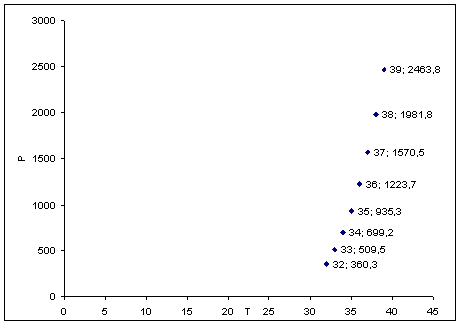 Рис. 1. Экспериментальная зависимость P=f(T) В результате анализа данных выберем в качестве аппроксимирующего многочлена параболу, заданную уравнением P2(x)=a0+a1x+a2x2. Для определения коэффициентов a0, a1, a2 запишем систему уравнений вида