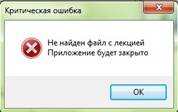 Рисунок 5.2. Поведение программы в исключительной ситуации К сожалению, результаты прошлого тестирования студентов утеряны. Программа в корневом каталоге создала новый файл и при повторном тестировании будет произведена запись результатов в этот файл. Значит, тестирование можно провести заново и результаты тестирования будут фиксироваться и сохраняться. Проведем еще один эксперимент по созданию исключительной ситуации с электронным учебником по дисциплине «Программирование». Теперь студенты удалили файлы с лекциями по темам. При попытке запуска лекций программа выдаст системную ошибку (рисунок 5.3).