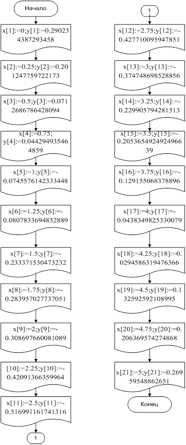Рис 3.3 Процедура среднеквадратичного приближения program srpribl; {$R+} uses graph; label 1,2,3,4; const m=2; type mas= array [1..21] of real; mas1= array [1..m] of real; mas2= array [1..m,1..m+1] of real; var i,j:byte; y1,x1:mas; xx1:mas1; a1:mas2; procedure vvod (x,y: mas); begin x[1]:=0;y[1]:=0.290234387293458; x[2]:=0.25;y[2]:=0.201247759722173; x[3]:=0.5;y[3]:=0.0712686786428094;x[4]:=0.75; y[4]:=0.044294935464859; x[5]:=1;y[5]:=-0.0745576142333448; x[6]:=1.25;y[6]:=-0.0807833694852889; x[7]:=1.5;y[7]:=-0.233371530473232;x[8]:=1.75;y[8]:=-0.283957027737051; x[9]:=2;y[9]:=-0.308697660081089;x[10]:=2.25;y[10]:=-0.42091366359964; x[11]:=2.5;y[11]:=-0.516991161741316;x[12]:=2.75;y[12]:=-0.427710095947851; x[13]:=3;y[13]:=-0.374748698528856;x[14]:=3.25;y[14]:=-0.229905794281513; x[15]:=3.5;y[15]:=-0.205365492492496639;x[16]:=3.75;y[16]:=-0.129155068378896; x[17]:=4;y[17]:=-0.0438349825330079;x[18]:=4.25;y[18]:=0.0294586319476366; x[19]:=4.5;y[19]:=0.132592592108995;x[20]:=4.75;y[20]:=0.206369574274868; x[21]:=5;y[21]:=0.26959548862651; end; procedure srpribl (xx:mas1;a:mas2); var l:real; s,z,k1:integer; begin for s:=1 to m-1 do for z:=s+1 to m do begin a[z,s]:=-a[z,s]/a[s,s]; for k1:=s+1 to m+1 do a[z,k1]:=a[z,k1]+a[z,s]*a[s,k1] end; xx[m]:=a[m,m+1]/a[m,m]; writeln(' xx[',m,']=',xx[m]:2:3); for i:=m-1 downto 1 do begin l:=a[i,m+1]; for j:=i+1 to m do l:=l-xx[j]*a[i,j]; xx[i]:=l/a[i,i]; writeln(' xx[',i,']=',xx[i]:2:3) end end; procedure Grafik (var x,y:mas;xx:mas1) var ec,gd,gm:integer; begin gd:=detect; initgraph (gd,gm,' '); ec:=graphresult; if ec<>grok then begin writeln ('Oshibka v inicializacii grafika'); halt (1); end; setcolor(white); line (0,420,620,420); line (0,0,0,420); setcolor (white); for i:=1 to 21 do begin circle (round (x[i]*150),round (y[i]*100),1); end; setcolor (yellow); for i:=1 to m do begin circle (round (x[i]*150),round (xx[i]*100),1); end; setcolor (green); for i:=2 to m do begin line (round (x[i-1]*150),round(xx[i-1]*100),round (x[i]*150), round (xx[i]*100)); end; end; begin vvod(x1,y1); for i:=1 to 2 do for j:=1 to 3 do a[i,j]:=0; a[1,1]:=21; for i:=1 to 21 do begin a[1,2]:=a[1,2]+x[i]; a[2,1]:=a[2,1]+x[i]; a[2,2]:=a[2,2]+x[i]*x[i]; a[1,3]:=a[1,3]+y[i]; a[2,3]:=a[2,3]+y[i]*x[i] end; srpribl(xx1,a1); for i:=1 to 21 do writeln(y[i]:2:3,' ',xx[1]+xx[2]*x[i]:2:3); Grafik(x1,y1,xx1); end. 3.7 Тестовый пример