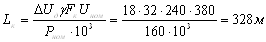 автомат А-3730Б Iт.р = 400А, По номинальным мощностям электродвигателей выбираем магнитные пускатели с тепловыми реле. Для двигателя с Рном = 55кВт и током Iном = 109,4А выбираем пускатель защищённого исполнения типа ПАЕ-522 с тепловым реле ТРП-150. Предельная мощность включаемого двигателя 55кВт. Анологично выбираем пускатели и для остальных двигателей. Рном = 1,1кВт, пускатель ПМЕ-122 с тепловым реле ТРН-8 на 4кВт; Рном = 0,18кВт, пускатель ПМЕ-122 с тепловым реле ТРН-8 на 4кВт; Рном = 200кВт, контакторы трёхполюсные КТВ-35 Iном = 600А. Рном = 160кВт, контакторы трёхполюсные КТВ-35 Iном = 600А. Определяем длину кабельных линий по допустимой потере напряжения с учётом потерь в магистральных кабелях, для 0,38кВ составляет 19В. Длина кабеля проложенного в трубе составит для двигателя мощностью: Рном =55кВт, Рном = 1,1кВт,