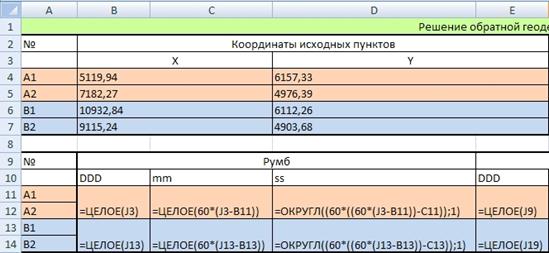 Рис. 1.6 Проверка в MathCad 14. Таким образом, обратная геодезическая задача была решена с помощью языка программирования Turbo Pascal и затем была проверена с помощью табличного процессора Microsoft Excel 2007 и MathCad 14.Результаты решений совпали, что говорит о правильности выбранного алгоритма решения задачи. 2. Прямая угловая засечка 2.1 Теоретические сведения Прямая угловая (геодезическая) засечка - такое