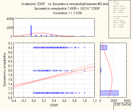 4. Висновки по первинному статистичному аналізі При проведенні первинного статистичного аналізу було обчислено статичні характеристики такі, як математичне сподівання, середнє квадратичне відхилення, коефіцієнт ексцесу та асиметрії, довірчі інтервали та визначено закони розподілу. У відповідності до отриманих даних можна зробити наступні висновки: Метрики з нормальним розподілом - CYCLO - NOP - FOUT - AMW - Ефективність(експертна оцінка) Метрики з ненормальним розподілом - HIT - BOvR - CC - CDISP - ATFD - Зрозумілість інтерфейсу(експертна оцінка) Ці дані будуть в подальшому використовуватись для кореляційного та регресійного аналізу. 5. Кореляційний аналіз з кореляційними полями та розрахованими коефіцієнтами кореляції, та перевірками Визначення кореляції. Кореляція являє собою міру залежності змінних. Найбільш відома кореляція Пірсона. При обчисленні кореляції Пірсона передбачається, що змінні виміряні, як мінімум, у інтервального шкалою. Деякі інші коефіцієнти кореляції можуть бути обчислені для менш інформативних шкал. Коефіцієнти кореляції змінюються в межах від -1.00 до +1.00. Зверніть увагу на крайні значення коефіцієнта кореляції. Значення -1.00 означає, що змінні мають строгу негативну кореляцію. Значення +1.00 означає, що змінні мають строгу позитивну кореляцію. Відзначимо, що значення 0.00 означає відсутність кореляції. Негативна кореляція. Дві змінні можуть бути пов'язані таким чином, що при зростанні значень однієї з них значення іншої зменшуються. Це і показує негативний коефіцієнт кореляції. Про такі змінні говорять, що вони негативно корельовані. Позитивна кореляція. Зв'язок між двома змінними може бути такою - коли значення однієї змінної зростають, значення іншої змінної також зростають. Це і показує позитивний коефіцієнт кореляції. Про такі змінні говорять, що вони позитивно корельовані. Найбільш часто використовуваний коефіцієнт кореляції Пірсона r називається також лінійної кореляцією, тому що вимірює ступінь лінійних зв'язків між змінними. Проста лінійна кореляція (Пірсона r). Кореляція Пірсона (далі називана просто кореляцією) припускає, що дві розглянуті перемінні виміряні в інтервальній шкалі. Вона визначає ступінь, з якою значення двох змінних "пропорційні" один одному. Важливо, що значення коефіцієнта кореляції не залежить від масштабу виміру. Наприклад, кореляція між ростом і вагою буде однієї і тієї ж, незалежно від того, проводилися виміри в дюймах і чи фунтах у сантиметрах і кілограмах. Пропорційність означає просто лінійну залежність. Кореляція висока, якщо на графіку залежність "можна представити" прямою лінією (з позитивним чи негативним кутом нахилу). Помилкові кореляції. Грунтуючись на коефіцієнтах кореляції, ви не можете строго довести причинного залежності між змінними , однак можете визначити помилкові кореляції, тобто кореляції, які обумовлені впливами "інших", що залишаються за межами вашого поля зору змінних. Найкраще зрозуміти помилкові кореляції на простому прикладі. Відомо, що існує кореляція між шкодою, завданою пожежею, і кількістю пожежних, почали гасити пожежу. Однак ця кореляція нічого не говорить про те, наскільки зменшаться втрати, якщо буде викликано менше число пожежних. Причина в тому, що є третя змінна яка впливає як на заподіяний збиток, так і на число викликаних пожежників. Якщо ви будет