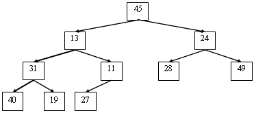 1. A [1] - корінь дерева; 2. Якщо A [i] - вузол дерева і 2i £ n, то A [2*i] - вузол - “лівий син" вузла A [i] 3. Якщо A [i] - вузол дерева і 2i + 1 £ n, то A [2*i+1] - вузол - “правий син" вузла A [i] Правила 1-3 визначають у масиві структуру дерева, причому глибина дерева не перевершує [log2 n] + 1. Вони ж задають спосіб руху по дереву від кореня до листків. Рух вгору задається правилом 4: 4. Якщо A [i] - вузол дерева і i > 1,то A [i mod 2] - вузол - “батько" вузла A [i] ; Приклад: Нехай A = [45 13 24 31 11 28 49 40 19 27] - масив. Відповідне йому дерево має вид: