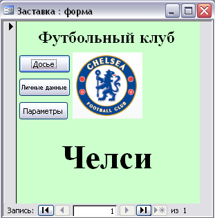 Форма 2.Фрагмент формы «Досье». 2.Стартовая форма при запуске Microsoft Access. Существует возможность назначить форму, которая будет выводиться на экран при открытии базы данных. Стартовая форма футбольного клуба «Челси»