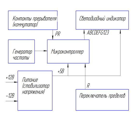 Рисунок 1.1 - Схема электрическая структурная Схема электрическая структурная содержит: микроконтроллер, контакты прерывателя, переключатель пределов, светодиодный индикатор, генератор тактовой частоты и источник питания. Этот тахометр предназначен для использования при регулировке холостого хода карбюраторов двигателей внутреннего сгорания. Его можно применять и для контроля частоты вращения вала автомобильных или лодочных двигателей во время движения. Тахометр имеет три разряда индикации с пределом измерения от 60 мин"1 до 7800 мин-1. Погрешность измерения на пределе 1 секунда равна 30 мин-1, а на пределе 3 секунды — 10 мин-1. Нижний предел ограничен погрешностью измерения, а верхний — количеством прерываний между индикацией. Из-за чего индикация разрядов становится прерывистой. 2 Составление схемы электрической функциональной Схема электрическая функциональная представлена на рисунке 2.1