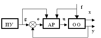 Рис.5. Структурная схема системы автоматического управления На структурной схеме приняты следующие обозначения. ПУ - программное (задающее устройство), АР - устройство управления (автоматический регулятор), ОО - обобщенный объект, g – задающее воздействие или задание, e – ошибка регулирования, u - управляющие координаты или величины, вырабатываемые устройством управления (АР); x - зависимые переменные (обобщенные или фазовые координаты), которые однозначно характеризуют состояние управляемого процесса в любой момент времени; y – управляемые координаты, которые в процессе управления измеряются и используются для оценки качества функционирования системы управления; f - внешние неконтролируемые переменные (возмущающие воздействия), отклоняющие y от заданных значений. В структурной схеме (рис. 5) реализуется фундаментальный принцип управления - принцип обратной связи, когда информация с выхода объекта после соответствующей обработки в устройстве управления поступает на его вход. Причем управляющие воздействия, подаваемые на вход объекта, вычисляются таким образом, чтобы обеспечить достижения заданной цели управления и скомпенсировать неблагоприятные изменения управляемых координат y при неконтролируемом действии внешних возмущений f. Управление - это совокупность действий, осуществляемых на основе определения информации и направляемых на поддержание или улучшение функционирования объекта в соответствии с имеющейся программой (алгоритмом) или целью управления. Автоматическое управление - управление, осуществляемое без участия человека. Как правило, цель