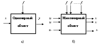 Рис. 3.6. Гистограмм ошибки идентификации. 4. Расчет характеристик математической модели объекта управления 4.1 Математические модели в пространстве состоянийМатематическая модель (образ) представляет собой абстрактное отражение реального объекта (оригинала, прообраза). В зависимости от типа объекта и целей, ради которых строится и используется модель, формальное описание может быть различным. Для моделирования объектов могут быть использованы структурные схемы, операторные уравнения, алгебраические уравнения, дифференциальные, интегральные и интегро-дифференциальные уравнения, Марковские цепи, передаточные функции, частотные характеристики, весовые функции, графы и т. д. Все эти методы функционально связывают входные и выходные сигналы объекта. По количеству входов и выходов объекты и соответствующие им модели разделяют на одномерные и многомерные. Одномерными называют объекты, имеющие один вход и один выход, многомерными – объекты, имеющие несколько входов и выходов, причем число входов не обязательно равно числу выходов. Блок-схемы одномерного и многомерного объектов изображены соответственно на рис. 4.1,а и рис. 4.1,б. Причем число входов не обязательно равно числу выходов.