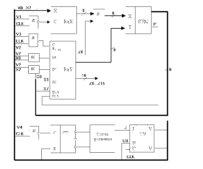 Рисунок 3.5 Схема управления сдвигом. Принципиальная схема, построенная по выражению (3.9), приведена на рис.3.5. Восьмиразрядный регистр для хранения Х будет представлять собой восемь JK – триггеров с объединенными тактовыми входами. Мощность, потребляемую регистрами, определим по формуле