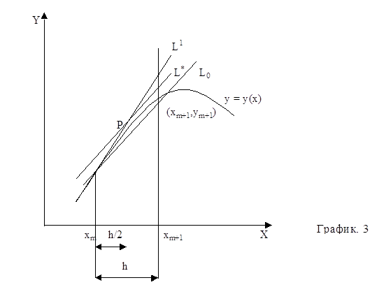 Чтобы выяснить, насколько хорошо этот метод согласуется с разложением в ряд Тейлора, вспомним, что разложение в ряд функции f(x,y) можно записать следующим образом: f(x,y)=f(xm,ym)+(x-xm)¶f/¶x+(y-ym)¶f/¶x+¼ 1.5 где частные производные вычисляются при x=xm и y=ym. Подставляя в формулу 1.5 x=xm+h и y=ym+hy¢m и используя выражение 1.3 для y¢m, получаем f(xm+h,ym+hy¢m)=f+hfx+hffy+O(h2), где снова функция f и ее производные вычисляются в точке xm,ym. Подставляя результат в 1.2 и производя необходимые преобразования, получаем Ф(xm,ym,h)=f+h/2(fx+ffy)+O(h2). Подставим полученное выражение в 1.4 и сравним с рядом Тейлора ym+1=ym+hf+h2/2(fx+ffy)+O(h3). Как видим, исправленный метод Эйлера согласуется с разложением в ряд Тейлора вплоть до членов степени h2, являясь, таким образом, методом Рунге-Кутты второго порядка. Рассмотрим модификационный метод Эйлера. Рассмотрим рис.3 где первоначальное построение сделано так же, как и на рис.2. Но на этот раз мы берем точку, лежащую на пересечении этой прямой и ординатой x=x+h/2. На рисунке эта точка образована через Р, а ее ордината равна y=ym+(h/2)y¢m. Вычислим тангенс угла наклона касательной в этой точке Ф(xm,ym,h)=f+(xm+h/2,ym+h/2*y¢m), 1.6 где y¢m=f(xm,ym) 1.7 Прямая с таким наклоном, проходящая через Р, обозначена через L*. Вслед за тем, мы проводим через точку xm,ym прямую параллельную L*, и обозначаем ее через L0. Пересечение этой прямой с ординатой x=xm+h и даст искомую точку xm+1,ym+1. Уравнение прямой можно записать в виде y=ym+(x-xm)Ф(xm,ym,h), где Ф задается формулой 1.6. Поэтому ym+1=ym+hФ(xm,ym,h) 1.8 Соотношения 1.6, 1.7, 1.8 описывают так называемый модификационный метод Эйлера и является еще одним методом Рунге-Кутта второго порядка. Обобщим оба метода. Заметим, что оба метода описываются формулами вида ym+1=ym+hФ(xm,ym,h) 1.9 и в обоих случаях Ф имеет вид Ф(xm,ym,h)=a1f(xm,ym)+a2f(xm+b1h,ym+b2hy¢m), 1.10 где y¢m=f(xm,ym) 1.11 В частности, для исправленного метода Эйлера a1=a2=1/2; b1=b2=1.